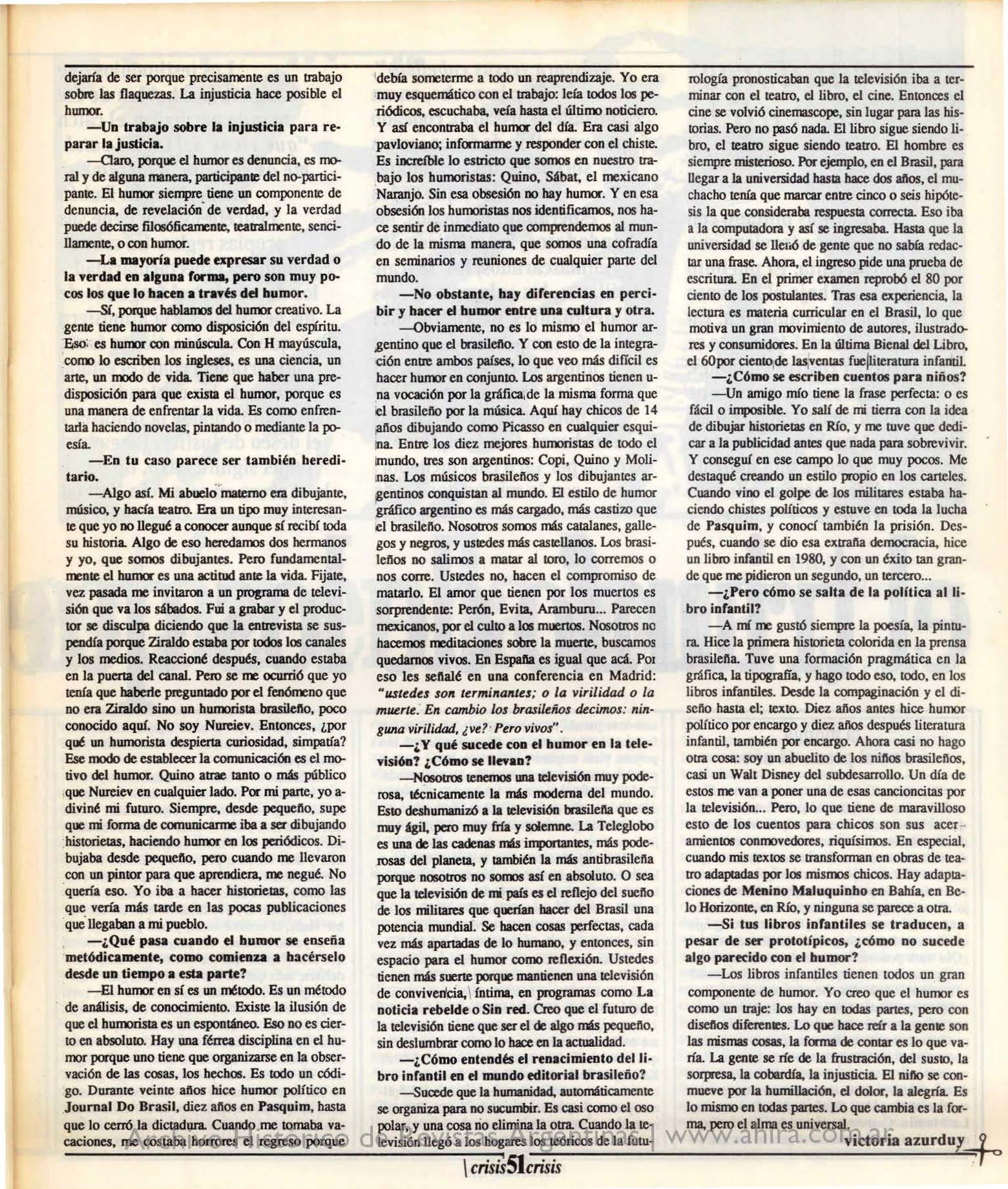 En junio de 1988, el dibujante brasileño Ziraldo le contaba a la revista crisis que Quino varias veces le había dicho que le había robado sus chistes y él les respondía que cómo no hacerlo, si el humor del mendocino debía ser compartido. Tan mítico como el humorista argentino, Ziraldo reflexiona en esta charla sobre el humor, sus puntos cruciales y los modos en los que la lectura le cambia la vida a las personas.