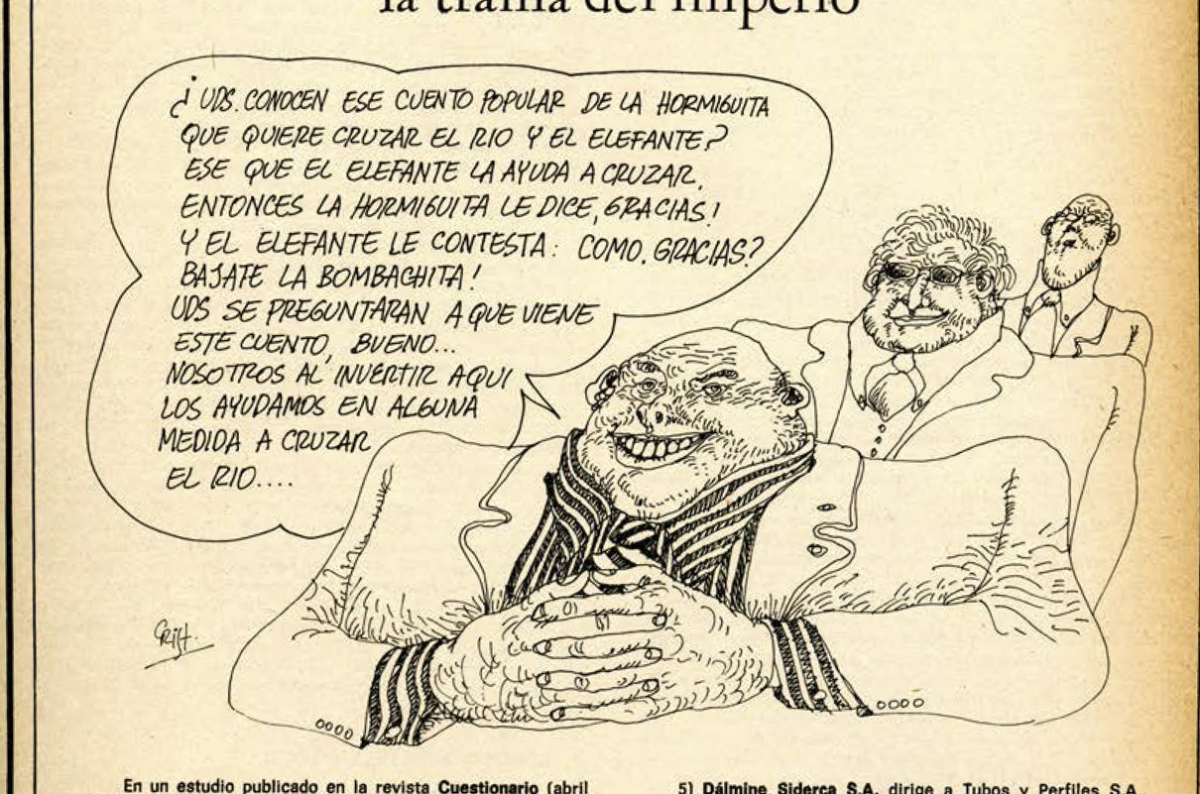 Sin distorsionar los hechos es posible afirmar que la historia de las inversiones extranjeras en Argentina -desde los lejanos tiempos de la Baring Brothers- es la historia del saqueo sistemático de nuestra economía, en exclusivo beneficio de las metrópolis imperialistas. O más concretamente: la historia paradojal de cómo un aporte insignificante -apoyado por sutiles estrategias legales o por maniobras sorprendentemente burdas- puede convertirse en la llave maestra de un enorme y desbordante poder económico, cuya influencia distorsionante se extiende a todas las esferas del quehacer nacional. Porque el papel del capital extranjero en nuestro país no se circunscribe a lo exclusivamente cuantitativo o económico. De manera más compleja la presencia de las inversiones extranjeras ha tenido y sigue manteniendo una particular incidencia no sólo sobre los aspectos específicamente económicos, sino también sobre un campo más amplio que concierne a lo social, político, militar, cultural, educacional, etc.