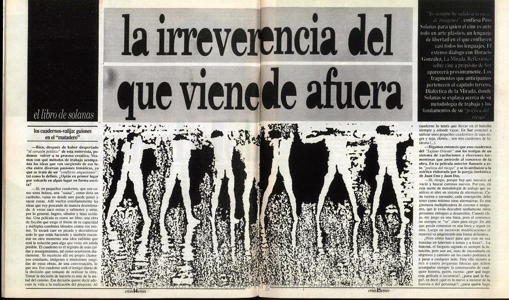 Pino Solanas murió el 7 de noviembre pasado. Tenía 84 años y una trayectoria que dejó huella en política y en el cine. En marzo de 1989, la revista crisis publicó un fragmento de un diálogo que tuvo con Horacio González, que luego se plasmó en el libro Mirada. Reflexiones sobre cine a propósito de Sur, en el que pueden conocerse sus secretos a la hora de filmar, de pensar las escenas y de entender la industria. Una charla en la que puede disfrutarse del Solanas artista y sus lúcidas reflexiones sobre el proceso creativo.