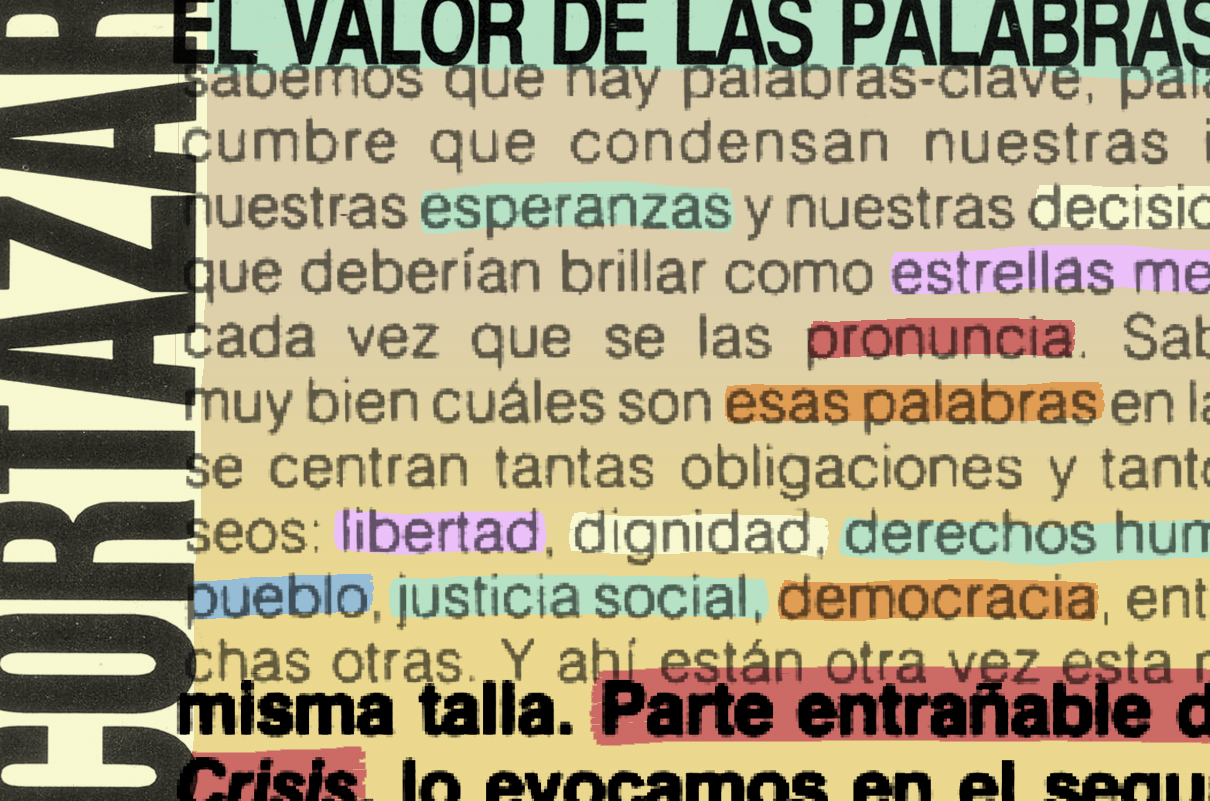 Palabras que se cansan, señala Cortázar, que se agotan, se caen, se gastan de tanto usarse. Palabras como democracia o libertad. ¿Cómo las arrastramos, las llevamos en remolque cuando ya no dan más? ¿Y qué pasa entonces? ¿Cómo usarlas con honestidad intelectual, desde el cobijo tibio de los privilegios? De estas cosas habló el autor de “El perseguidor”, en un discurso que dio en Madrid el 24 de marzo de 1981 y que fue publicado en la crisis #51.