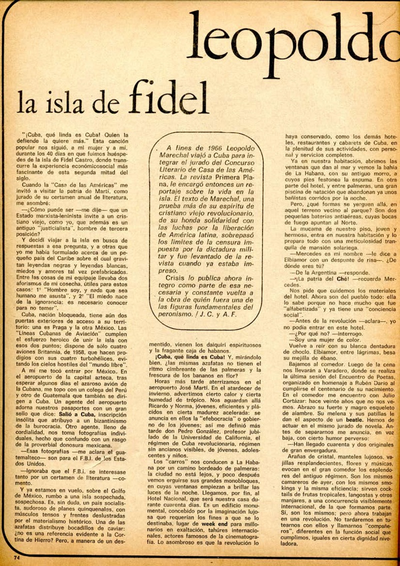 En 1966, Leopoldo Marechal viajó a Cuba como jurado del Concurso de Casa de las Américas y escribió una extenso texto que dejó ver su delicada y atenta mirada como cronista. El resultado salió publicado en Primera Plana, primero, pero la dictadura de Onganía censuró la nota cuando ya estaba impresa. En el número 10 de Crisis (febrero de 1974) ese registro se recuperó y deja ver la mirada fascinada del autor de Adán Buenosayres por la revolución cubana, Fidel y el espíritu de su gente.