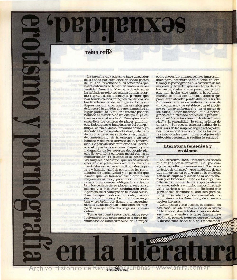 ¿Qué tenían para decir sobre el deseo las mujeres que durante años eran musas, aprendices, cuerpos consagrados al orgasmo del varón? Hoy todavía hay debates sobre el tema y recién en los últimos tiempos el goce femenino picó en punta. En este texto de 1987 en la revista crisis podemos ver cómo la escritora Reina Roffé se preguntaba por las fantasías femeninas y ponía el foco en esa tríada de erotismo, pornografía y sexualidad que hoy todavía nos genera preguntas sobre el goce más allá de las estructuras heteronormativas del patriarcado.