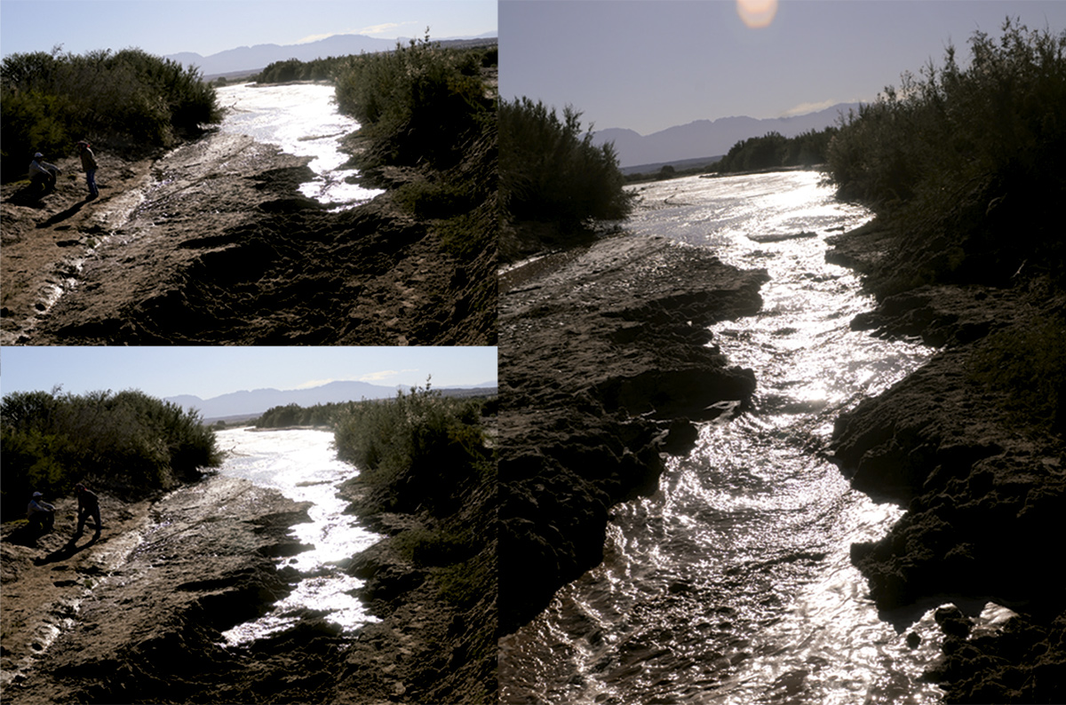 Cuando está por caer el atardecer, mientras una cuadrilla de campesinos quema la maleza de las acequias, se ve una extensa línea de tierra roja que corta el río. Tiene cinco metros de alto y ya logró desviar una parte del Colorado hacia el pueblo más seco del norte riojano. Bajo el sol, el agua rojiza se torna plateada y empieza a llenar el nuevo canal virgen, ante un auditorio de cien trabajadores exhaustos pero contentos.