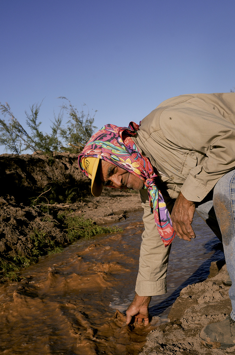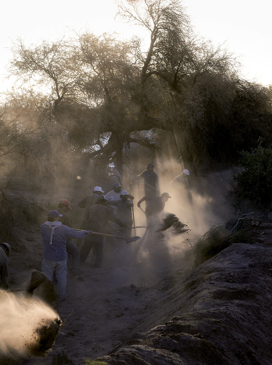 “Un día en la toma, en esta época de cosecha, son cien pesos menos en los olivares, pero lo hacemos una vez por año, y juntamos el agua para todos. Si no, nadie lo hará por nosotros”, dice Ruben Mamaní, mientras arma otro cigarrillo con los dedos de una sola mano y lo fuma apoyado en su pala. Tiene 48 años, empezó a cortar el Colorado a los 13, y considera que la toma es apenas una rutina de supervivencia.