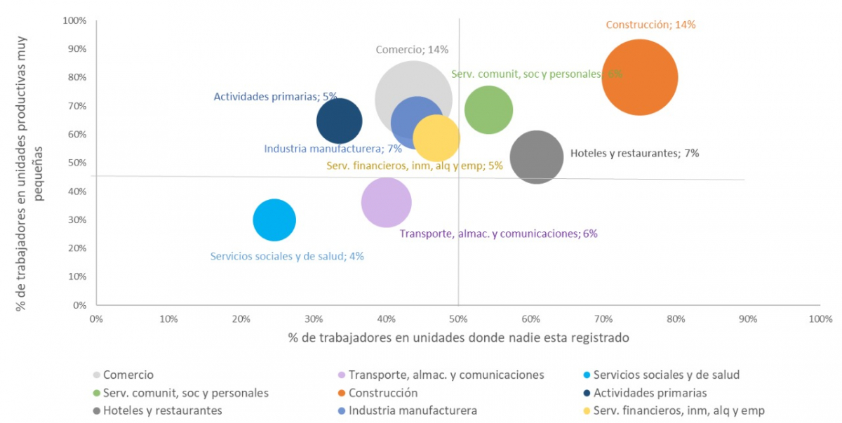 El gráfico siguiente muestra el total del empleo no registrado de acuerdo con su distribución por rama para identificar concentraciones. El tamaño de la burbuja indica cuánto aporta la rama al total de empleo no registrado. En el eje vertical se ubica el porcentaje del empleo no registrado que se da en unidades productivas muy pequeñas. En el eje horizontal, se presenta el porcentaje de trabajadores no registrados en establecimientos donde ningún trabajador está registrado, esto es, una especie de aproximación al grado de informalidad de la unidad productiva.