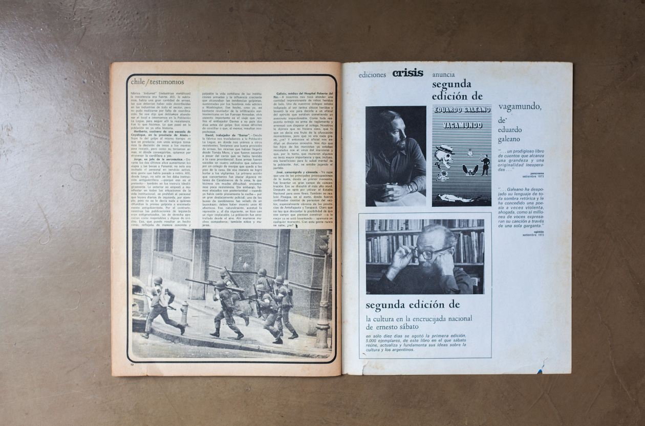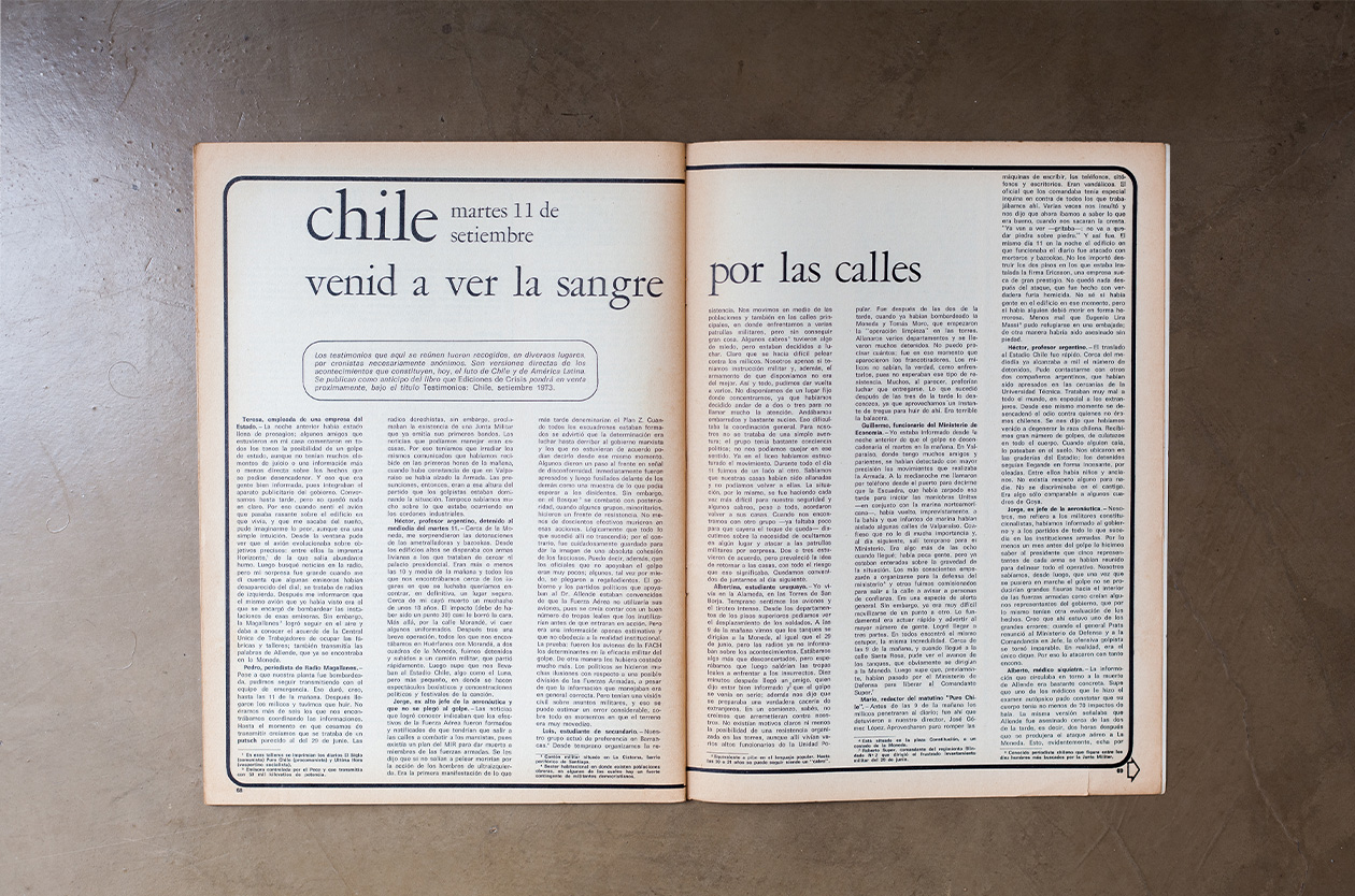 Cuando la represión ardía en todo su esplendor, un grupo de cronistas anónimos armó un registro en crudo que permitía tomar dimensión de lo que se vivió el 11 de septiembre de 1973 en Chile. Esos relatos en primera persona fueron publicados por Crisis y casi medio siglo más tarde resuenan de manera especial, en un nuevo aniversario del golpe comandado por Augusto Pinochet contra el gobierno socialista de Salvador Allende. Maestros, obreros, periodistas y hasta Isabel, la hija del entonces presidente chileno, componen un conjunto de voces urgentes que atraviesan el tiempo como una memoria viva de lo que fue.