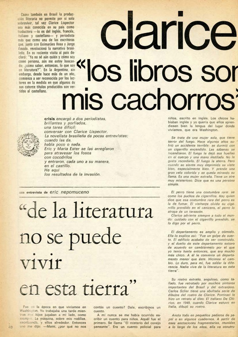Crisis encargó a dos periodistas brillantes y porfiados una tarea difícil: conversar con Clarice Lispector. La novelista brasileña da pocas entrevistas: cuando las da, habla poco o nada. Eric y María Esther se las arreglaron para atravesar los fosos con cocodrilos y entraron cada uno a su manera, en el castillo. He aquí los resultados de la invasión.