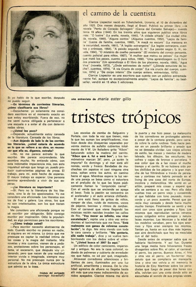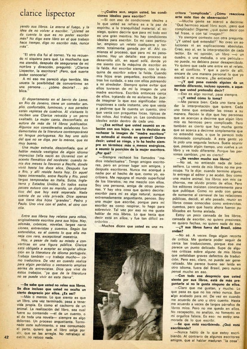 Como también en Brasil la producción literaria no permite por sí sola sobrevivir, tal vez Clarice Lispector sea más conocida en su país como traductora -lo es del inglés, francés, italiano y castellano- y periodista más que como una de las escritoras que, junto con Guimarães Rosa y Jorge Amado, revolucionó la narrativa brasileña. En su reciente visita al país declaró: “yo no sé aun quién y cómo soy, como persona aun me estoy buscando, ¿ cómo saber, entonces, lo que soy en literatura?. En la Argentina, sin embargo, desde hace más de un año comienza a ser reconocida por los lectores en la medida en que algunos de sus catorce títulos producidos son vertidos al castellano.