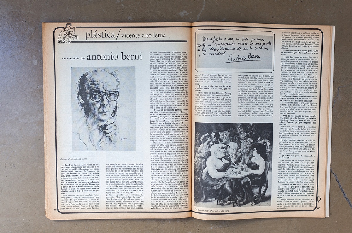 En el #37 de mayo de 1976, el pintor argentino discute con Vicente Zito Lema sobre su visión del rol del arte como instrumento de transformación social. Berni detalla cómo es que llega a sus obras, cómo las aborda desde la técnica y desde lo documental. Una entrevista ilustrada por el propio artista.