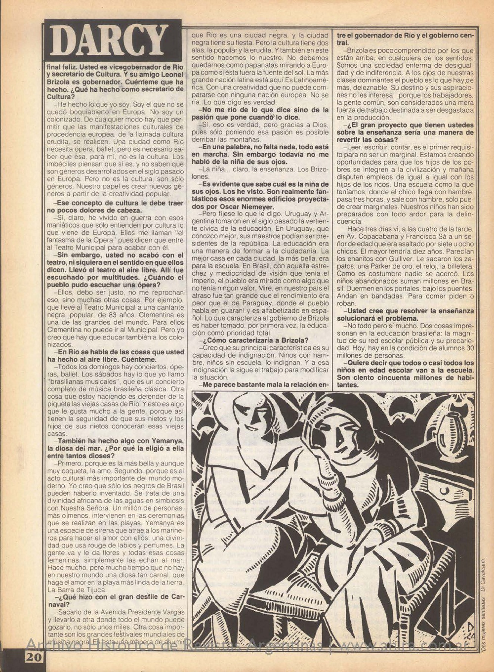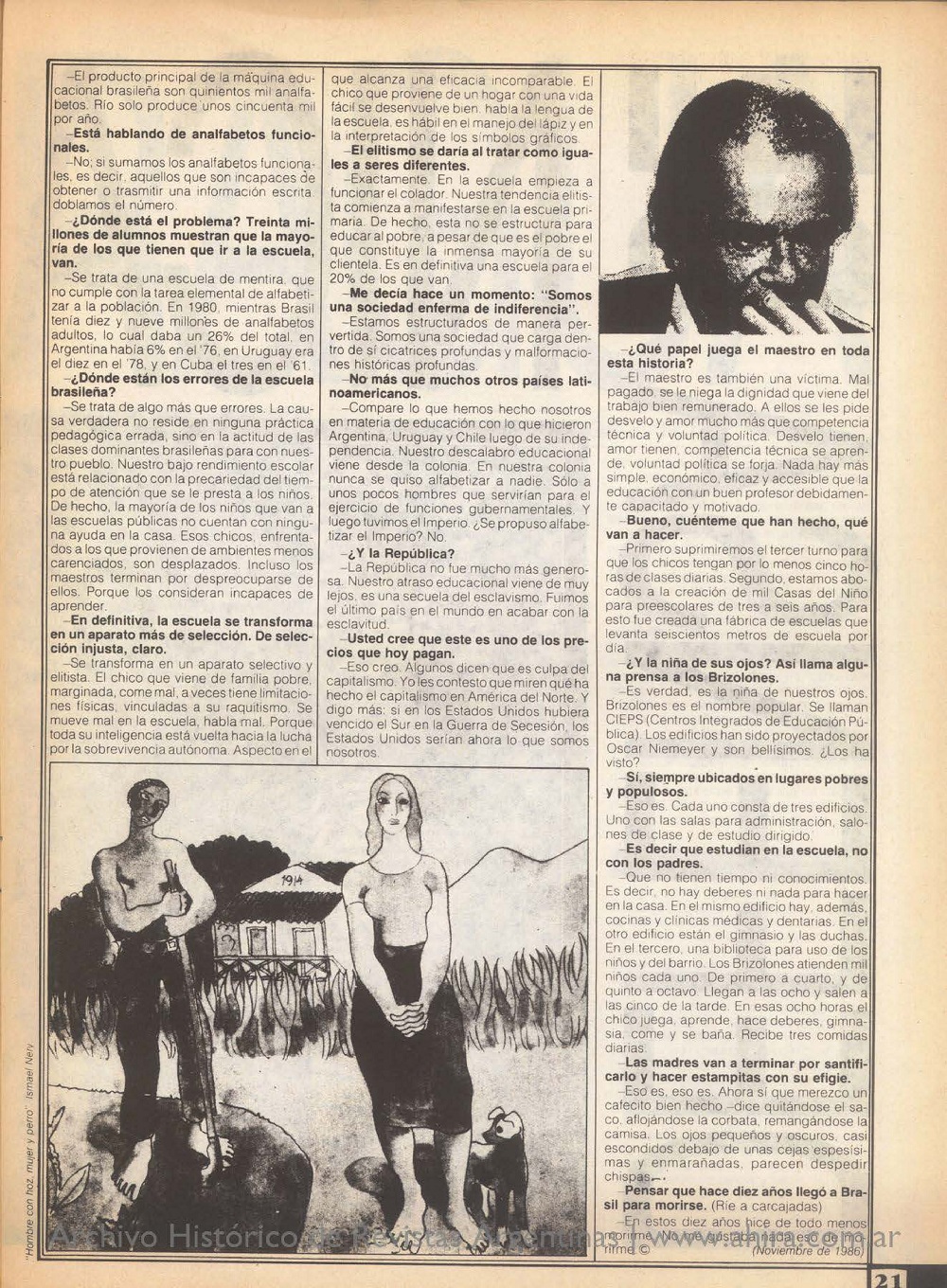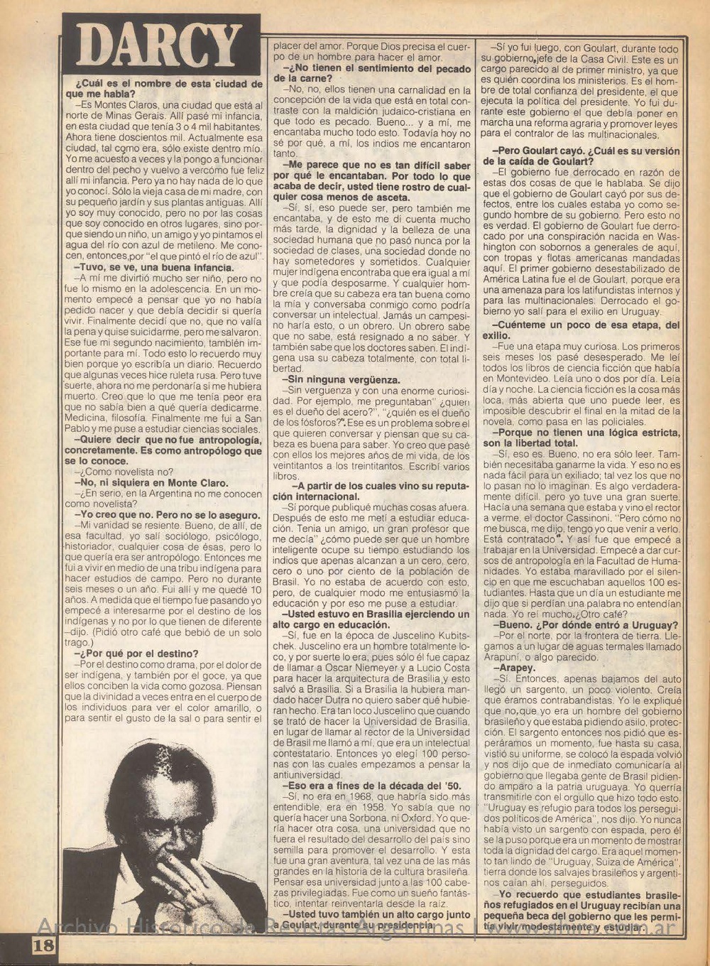 En diciembre de 1986, en la crisis #49, se publicó este reportaje en el que María Esther Gilio deja ver otra vez la parte más genuina de sus entrevistados. En este caso, la charla fue con Darcy Ribeiro, en ese momento vicegobernador y secretario de Cultura de Río de Janeiro; un reconocido intelectual que desde ideas que mezclaban antropología, sociología y política trajo con desenfado y compromiso social una manera de pensar entre otras cosas, al Brasil, que llamaba «pueblo nuevo» celebrando el mestizaje, y a toda América Latina. En tiempos en los que avanza la derecha en su país, vale recordar a quien siempre apostó por la utopía.