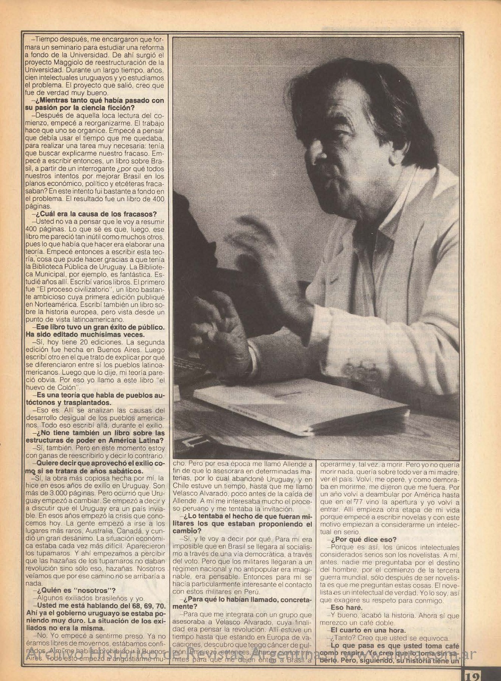 -Usted no va a pensar que le voy a resumir 400 páginas. Lo que sé es que, luego, ese libro me pareció tan inútil como muchos otros, pues lo que había que hacer era elaborar una teoría. Empecé entonces a escribir esta teoría, cosa que pude hacer gracias a que tenía la Biblioteca Pública de Uruguay. La Biblioteca Municipal, por ejemplo, es fantástica. Estudié años allí. Escribí varios libros. El primero fue «El proceso civilizatorio», un libro bastante ambicioso cuya primera edición publiqué en Norteamérica. Escribí también un libro sobre la historia europea, pero vista desde un punto de vista latinoamericano.