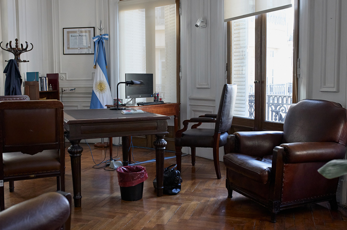 Un rápido recuento por esas imágenes colgantes ofrece pistas valiosas para comprender al personaje. Todos son políticos o políticas, no hay empresarios ni sindicalistas, ningún artista o deportista, tampoco militares, policías y mucho menos curas. Pero dentro de la corpo todo vale: retratos con Bush y con Clinton, con Uribe y con Raúl Castro, Lula y Bolsonaro, Néstor y Macri. Dentro de su despacho personal, allí donde pasa el mayor tiempo del día, solo hay dos instantáneas. Una de Alfonsín y Menem caminando de espaldas por los jardines de la Quinta de Olivos, ensimismados en sus cavilaciones. La otra sorprende: Cristina Fernández de Kirchner sonríe en su momento de esplendor, mientras abraza a un Pichetto de larga corbata celeste, que posa como un muñequito de torta. Le hago notar lo raro que me resulta ver a “la señora” en semejante sitial de honor. Elude el tema y comenzamos formalmente el reportaje.