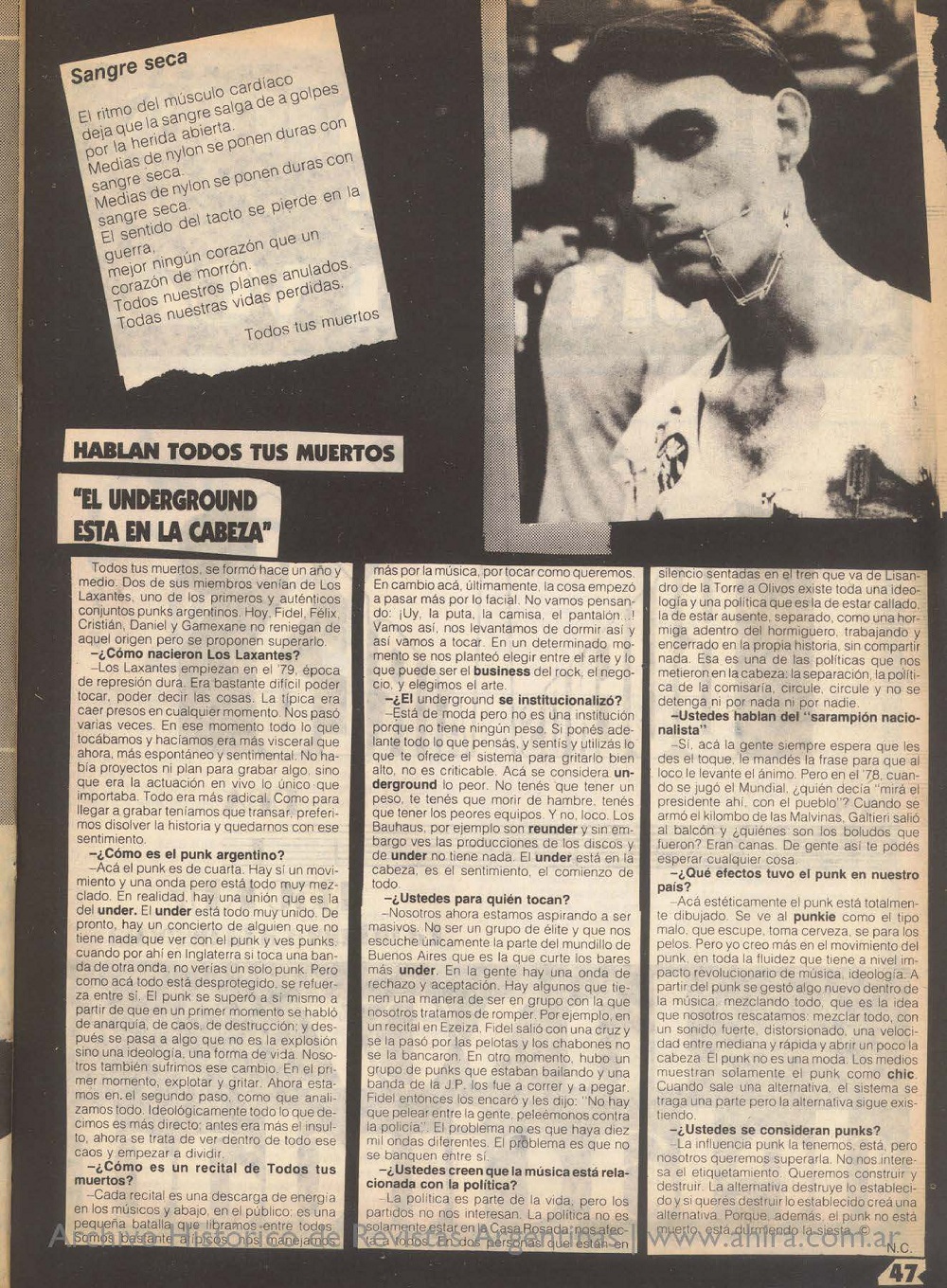 En 1986 la revista Crisis publicó un informe sobre la génesis de movimiento punk en el mundo, a diez años de su nacimiento. Y su latido en Argentina, donde un grupo que todavía no había sacado discos empezaba a ganarse un lugar en la historia de la música: Todos tus muertos. En un contexto de inflación, desempleo, copa del Mundo y paros generales, los músicos pensaban el significado del under, las tensiones con lo mainstream y alertaban sobre la política del silencio. Desde el pasado parecen provocarnos: ¿qué significa ser punk hoy?