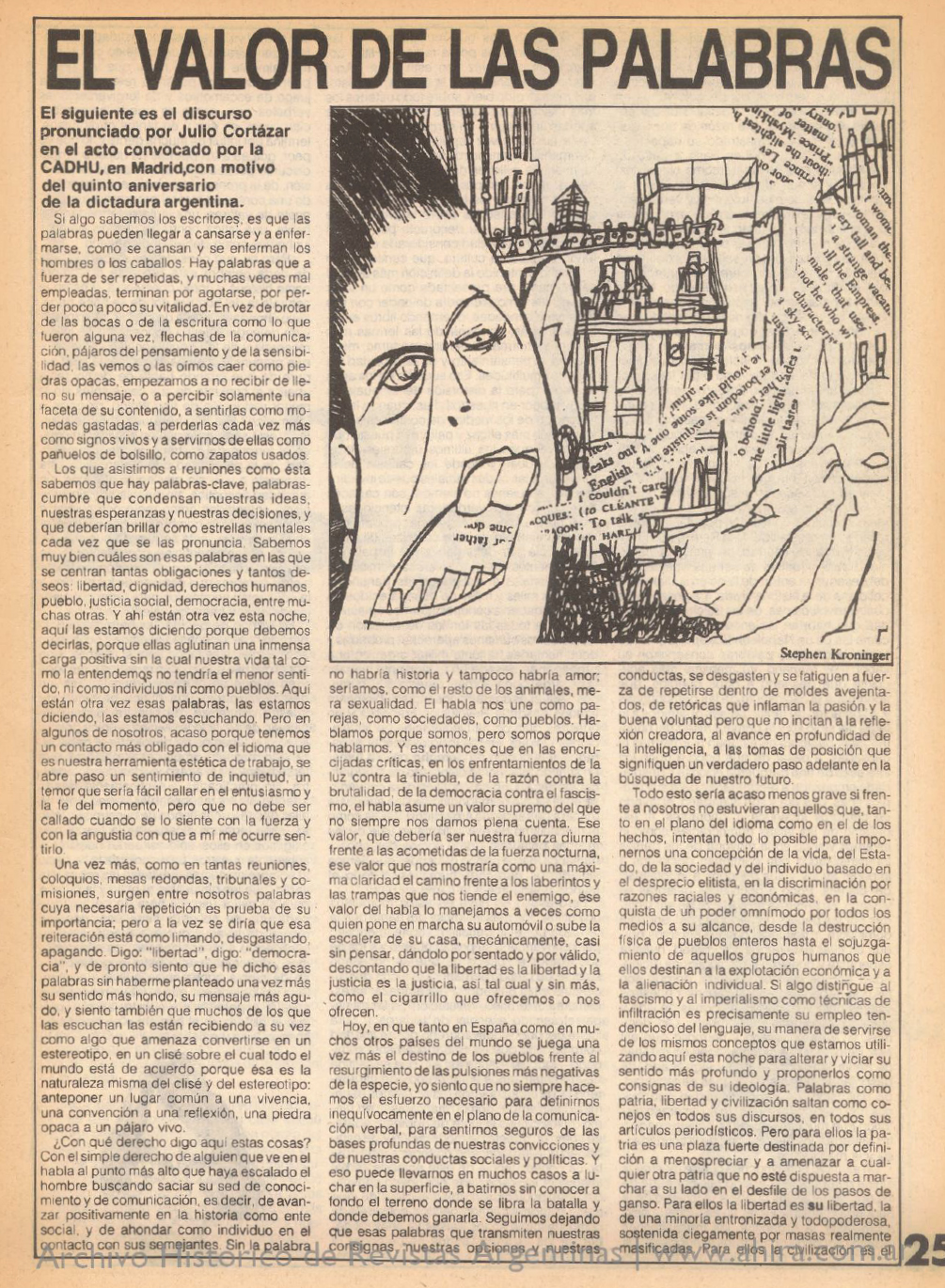 El siguiente es el discurso pronunciado por Julio Cortázar en el acto convocado por la CADHU, en Madrid, con motivo del quinto aniversario de la dictadura argentina.