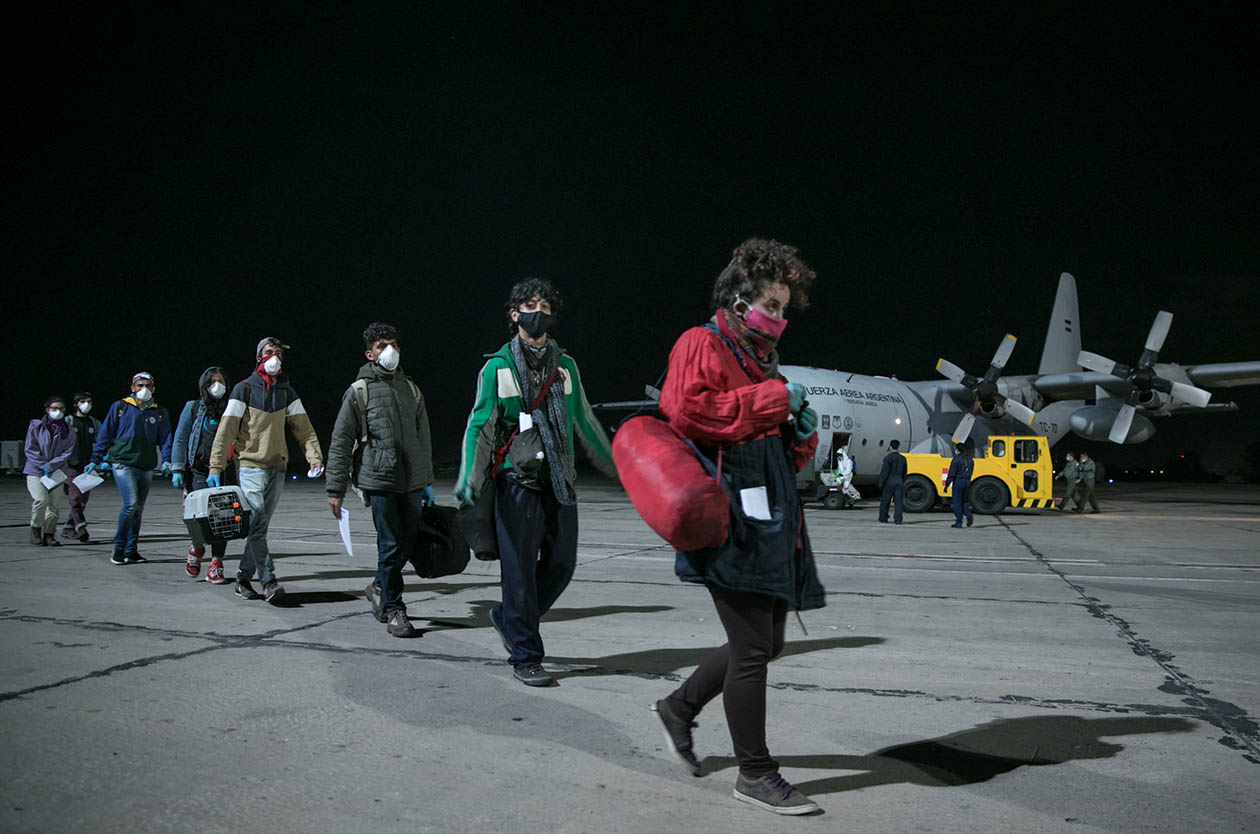 Carolina es tripulante de Aerolíneas Argentinas hace más de diez años y se anotó como voluntaria para hacer viajes de repatriación. El día que salió a volar intentó no pensar mucho pero se preparó más que de costumbre: aquietó los nervios haciendo gimnasia, comió “bien bien sanito” para tener las defensas altas y puso en su carry on algunas golosinas para compartir con el resto de la tripulación. Era la primera vez que volaba después de casi un mes sin pisar un avión. El remise de la empresa la condujo por calles vacías hasta Ezeiza donde la recibió un aeropuerto desolado. Durante la charla de rutina que realiza la tripulación antes de cada vuelo (briefing), el comandante dijo más o menos estas palabras: “Bueno, hagamos lo que mejor sabemos hacer: volar, darles seguridad a los pasajeros. Y cuidémonos, sobre todas las cosas”.