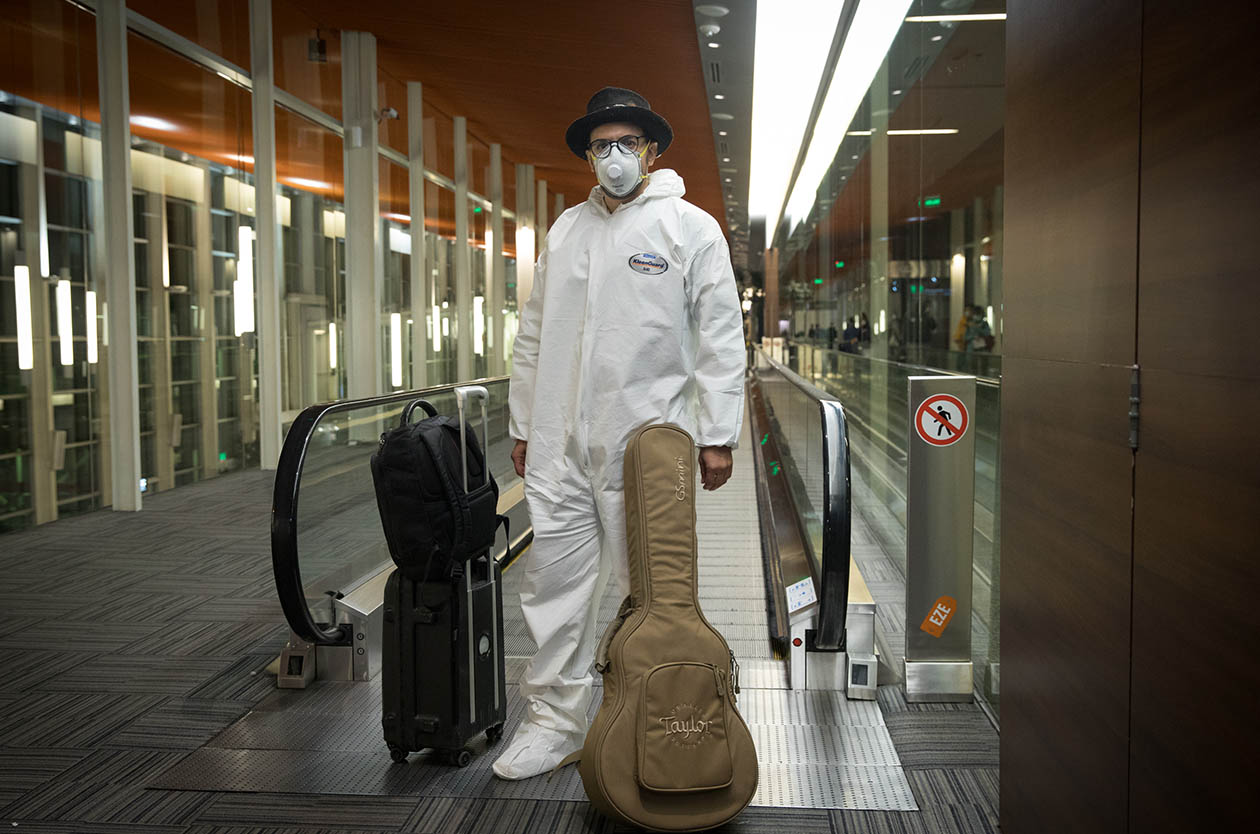 La aviación es por excelencia el medio de transporte del capitalismo globalizado. Los aeropuertos siempre fueron vanguardia a la hora de plantear un escenario futurista: entre el vidrio y el metal, ocupan dimensiones monumentales custodiadas por sistemas de vigilancia de última tecnología. Hoy los límites del futuro se empujan un poco más lejos, hacia el borde de la distopía. Las salas de embarque están delimitadas por cruces rojas y tildes verdes que indican dónde está permitido sentarse para respetar el distanciamiento social. Los mostradores de atención al público se fueron revistiendo de placas de vidrio y los uniformes de quienes trabajan se complementaron con gafas, guantes y máscaras.