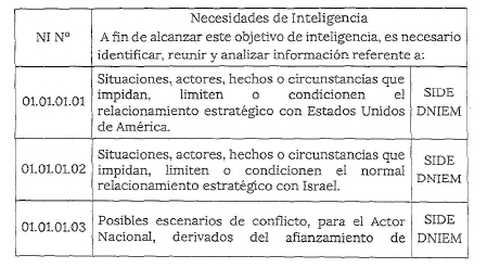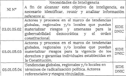 Si avanzamos hacia el OPI 5 de dicho Lineamiento Estratégico, que ordena seguir de cerca “la evolución de actores, actividades, procesos y escenarios con potencial impacto negativo sobre el orden constitucional, el funcionamiento institucional, la gobernabilidad democrática y la plena vigencia de los derechos constitucionales”, la inteligencia estatal se vuelca decididamente al accionar político, como leemos en las NI 02, 03 y 04.