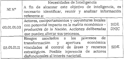 Nos detendremos en el primer Objetivo Particular de Inteligencia (OPI), que alude al “Orden Económico y Financiero” y se propone producir conocimiento sobre “la evolución de actores, hechos, factores y procesos con potencial impacto en la situación económica y financiera argentina”. Veamos las NI 03 y 11.