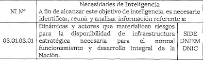 Idéntico riesgo se observa en el OPI 3 del mismo LE, dedicado a vigilar “la evolución de actores, actividades, procesos y escenarios que pudieran afectar el desarrollo de la infraestructura estratégica nacional”.