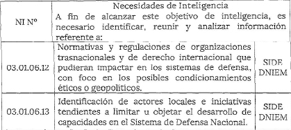 Dentro del mismo Lineamiento Estratégico, la OPI 6 apunta a los “potenciales impactos negativos en el desarrollo del sistema de Defensa Nacional” y allí los sospechosos podrían ser organismos de derechos humanos e incluso las instancias jurídicas internacionales.
