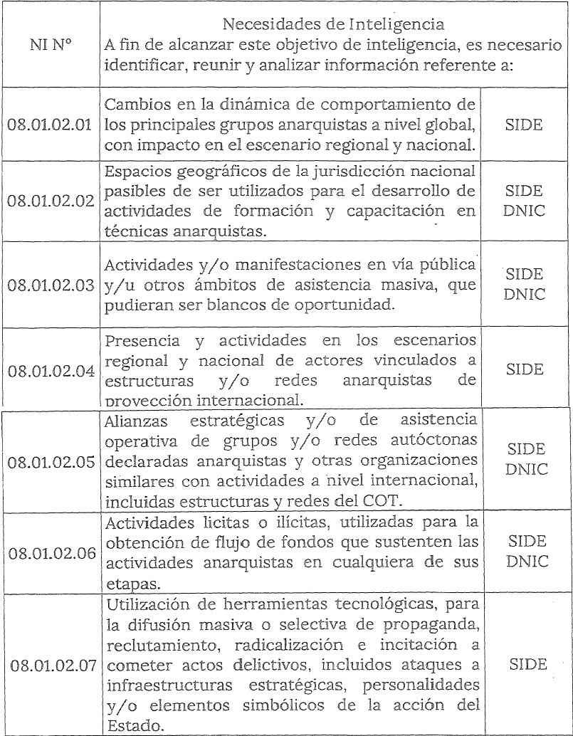 El Lineamiento Estratégico #8 está dedicado al ítem “Terrorismo” y en su Objetivo Particular de Inteligencia 2 ingresa, si se tiene en cuenta el lugar de enunciación, a una zona delirante. Se trata de un gobierno autodenominado anarco-capitalista cuyo propósito explícito consiste en destruir al estado, pero cataloga como terrorista a los “actores cuyo propósito manifiesto sea promover la ausencia de autoridad estatal como modelo de sociedad organizada”. El peligro de criminalizar a una ideología de larga tradición resulta inadmisible.