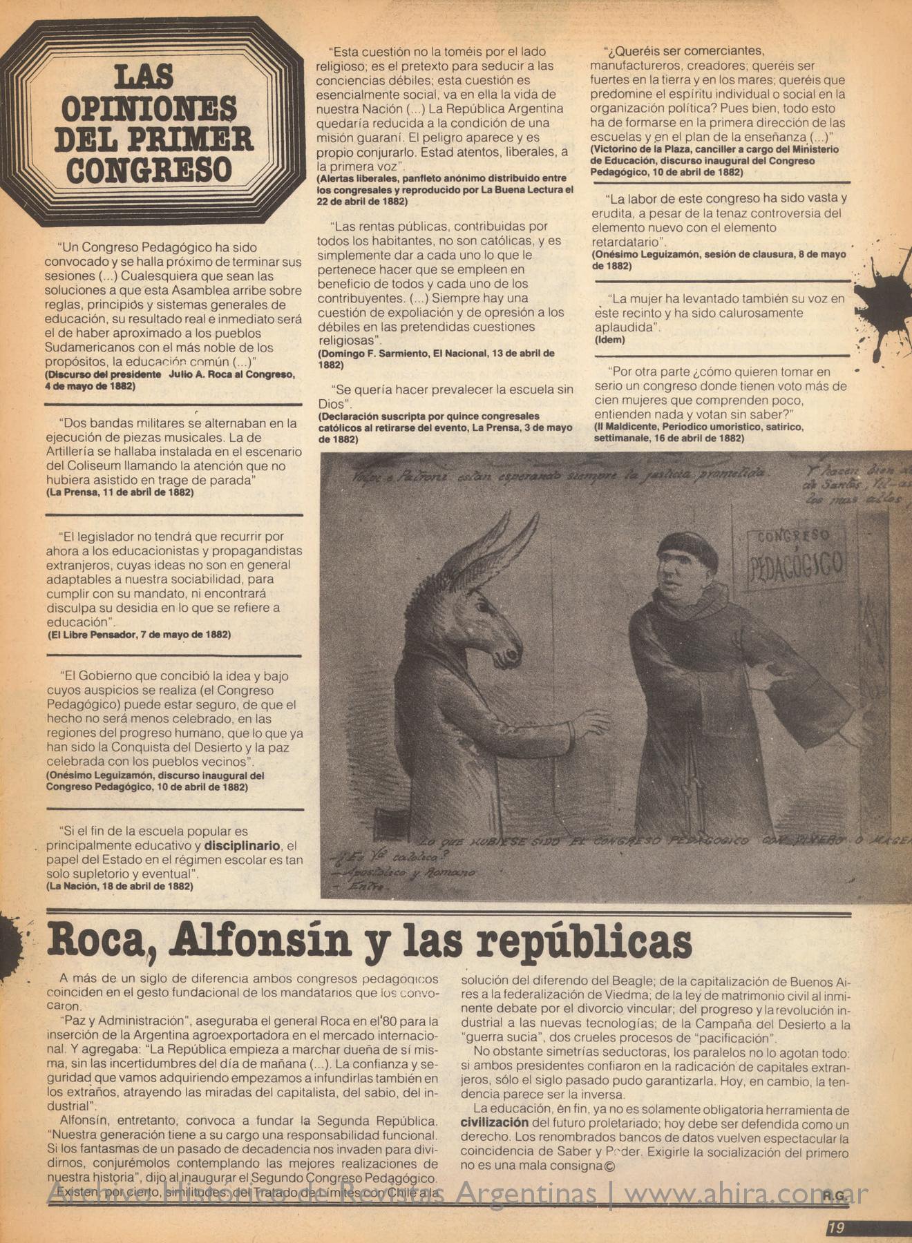 Alfonsín, entretanto, convoca a fundar la Segunda República. «Nuestra generación tiene a su cargo una responsabilidad funcional. Si los fantasmas de un pasado de decadencia nos invaden para dividirnos, conjurémoslos contemplando las mejores realizaciones de nuestra historia», dijo al inaugurar el Segundo Congreso Pedagógico.