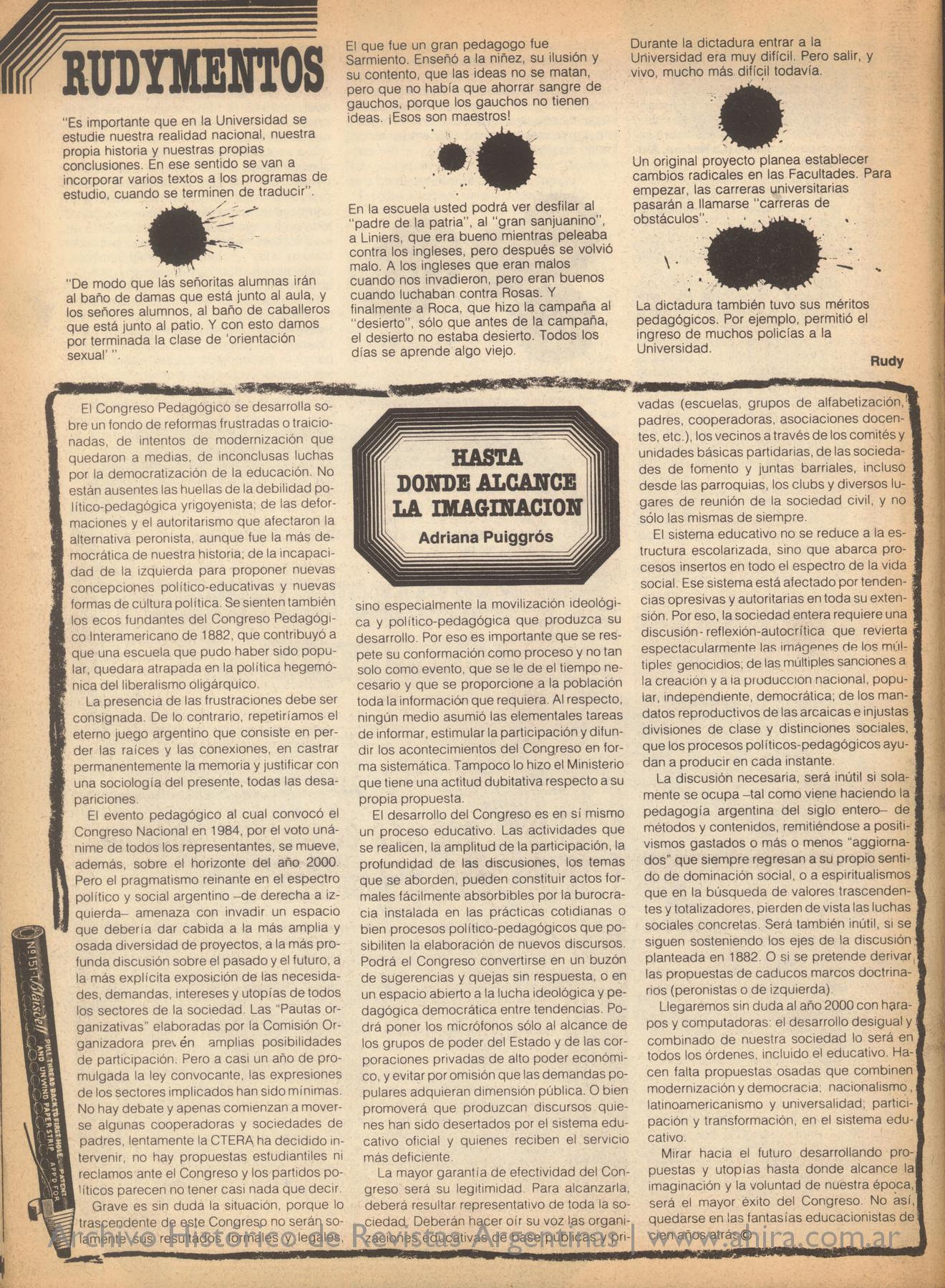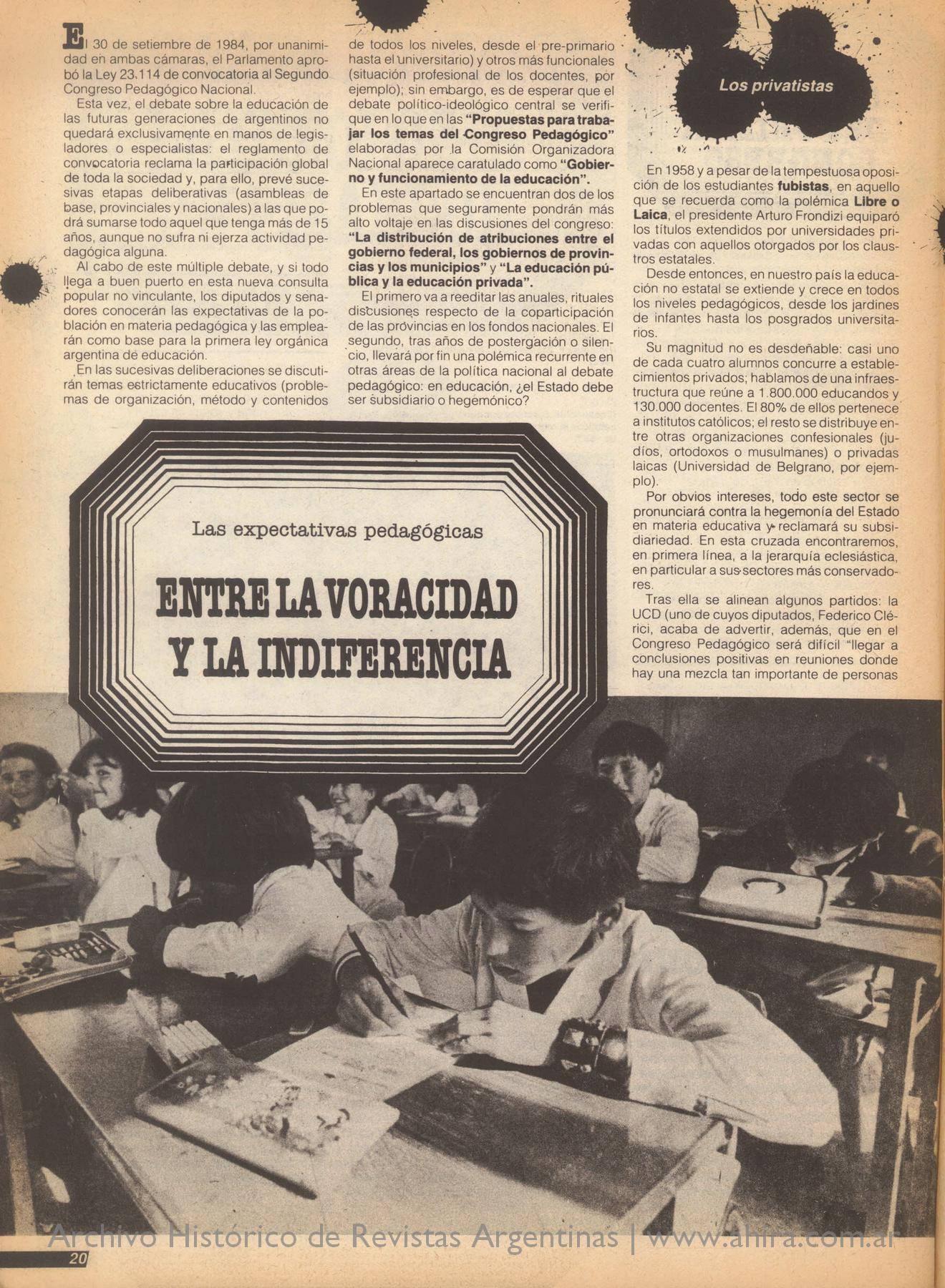 El evento pedagógico al cual convocó el Congreso Nacional en 1984, por el voto unánime de todos los representantes, se mueve, además, sobre el horizonte del año 2000. Pero el pragmatismo reinante en el espectro político y social argentino -de derecha a izquierda- amenaza con invadir un espacio que debería dar cabida a la más amplia y osada diversidad de proyectos, a la más profunda discusión sobre el pasado y el futuro, a la más explícita exposición de las necesidades, demandas, intereses y utopías de todos los sectores de la sociedad. Las “Pautas organizativas” elaboradas por la Comisión Organizadorta prevén amplias posibilidades de participación. Pero a casi un año de promulgada la ley convocante, las expresiones de los sectores implicados han sido mínimas. No hay debate y apenas comienzan a moverse algunas cooperadoras y sociedades de padres, lentamente la CTERA ha decidido intervenir, no hay propuestas estudiantiles ni reclamos ante el Congreso y los partidos políticos parecen no tener nada que decir.