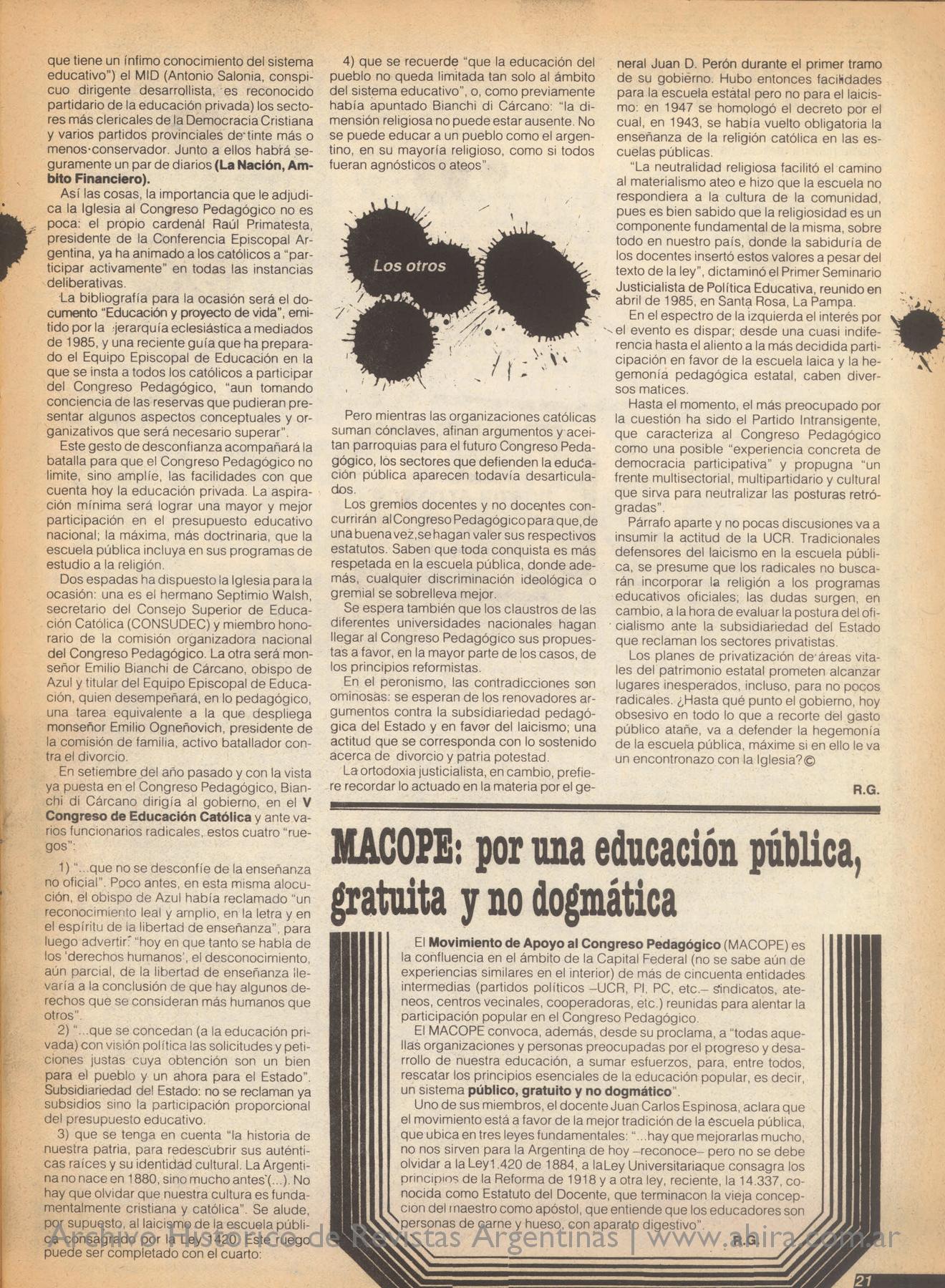 El Movimiento de Apoyo al Congreso Pedagógico (MACOPE) es la confluencia en el ámbito de la Capital Federal (no se sabe aún de experiencias similares en el interior) de más de cincuenta entidades intermedias (partidos políticos -UCR, PI, PC, etc.- sindicatos, ateneos, centros vecinales, cooperadoras, etc.) reunidas para alentar la participación popular en el Congreso Pedagógico.