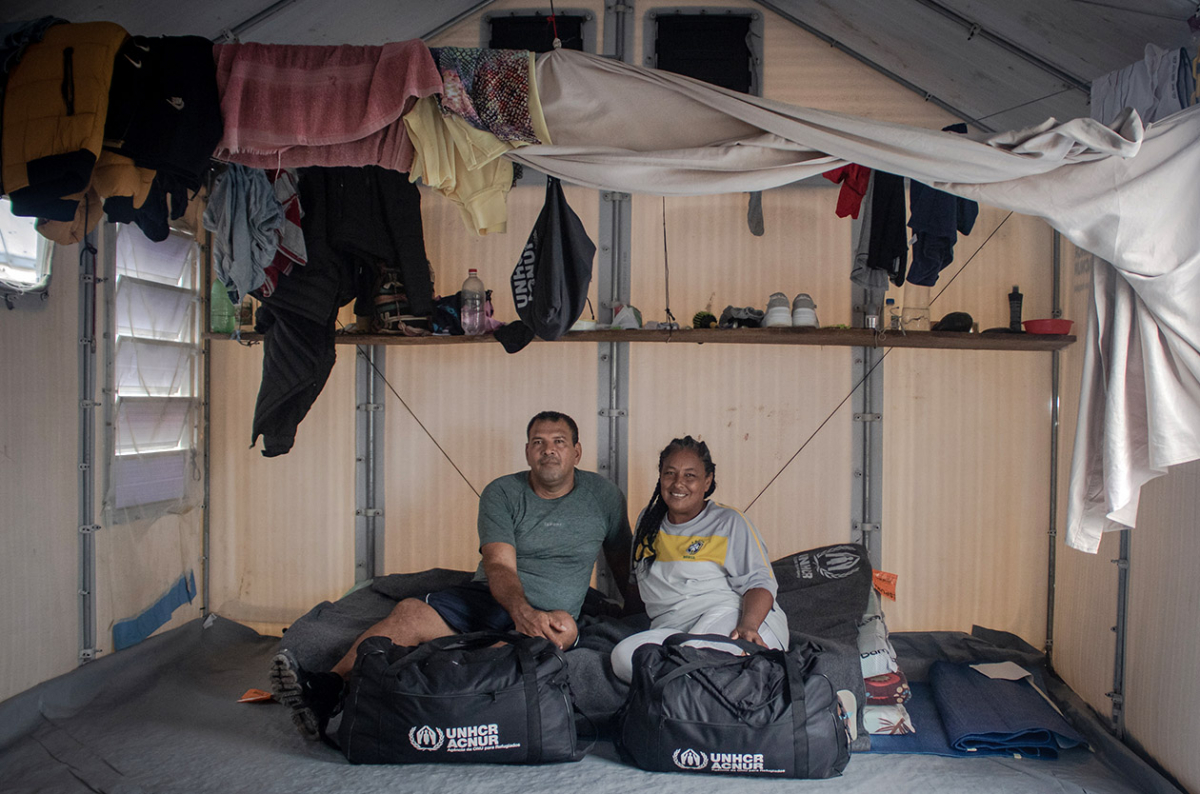 Lilia Betzaida Vargas Gómez y su marido en su carpa en Rondón 5, un refugio destinado a personas que ya iniciaron su proceso de interiorización. Lilia y su familia esperan traslado al estado de Río de Janeiro.