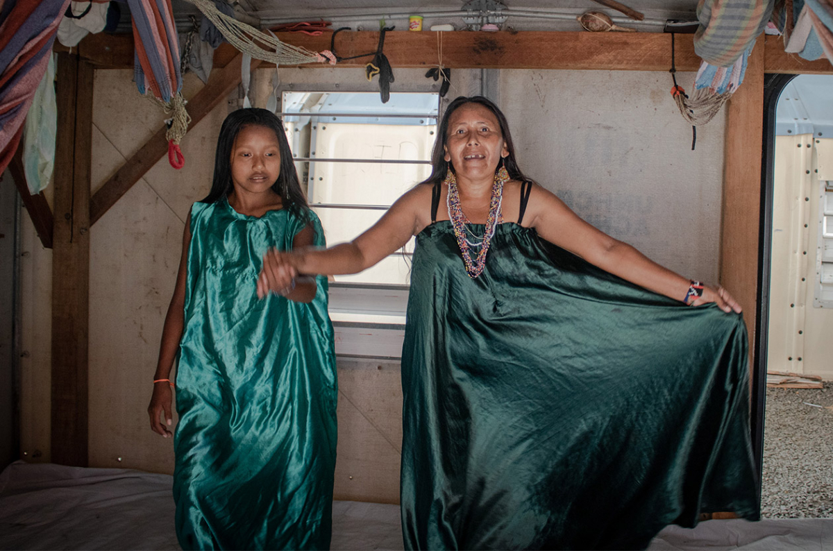 Yudilia Larosa (derecha) y su hija menor, indígenas de la etnia Warao, vestidas con trajes tradicionales, bailan danzas típicas de su pueblo dentro de la carpa donde viven en el albergue Jardim Floresta en Boa Vista, el albergue indígena más pequeño de Operação Acolhida.