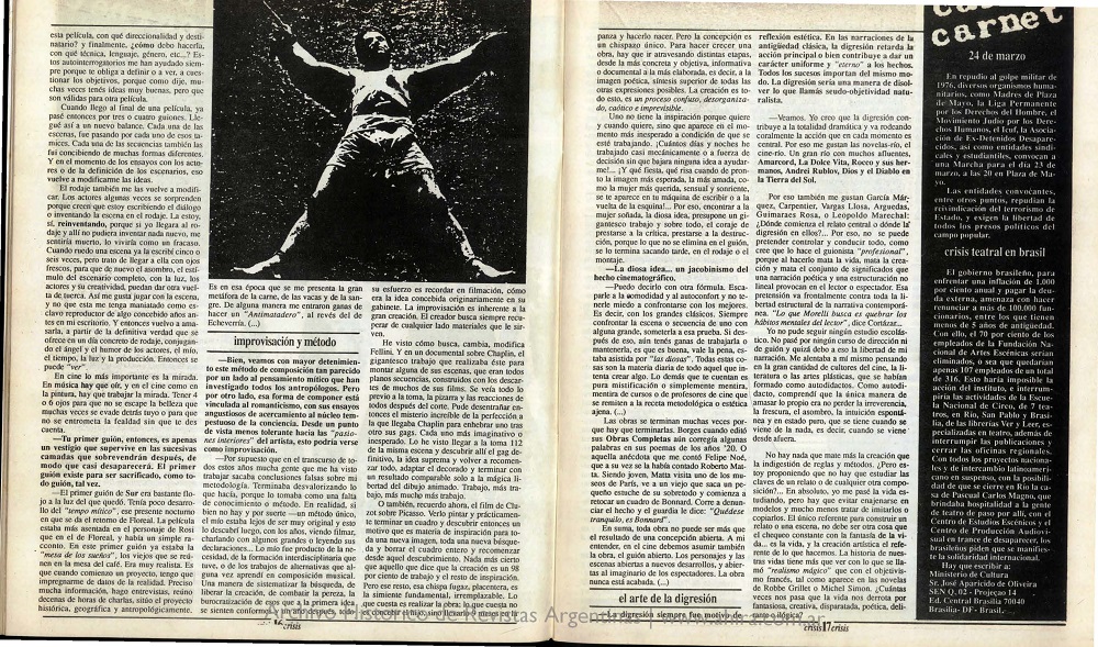 – Veamos. Yo creo que la digresión contribuye a la totalidad dramática y va rodeando coralmente la acción que en cada momento es central. Por eso me gustan las novelas-río, el cine-río. Un gran río con muchos afluentes, Amarcord, La Dolce Vita, Rocco y sus hermanos, Andrei Rublov, Dios y eJ Diablo en la Tierra del Sol.