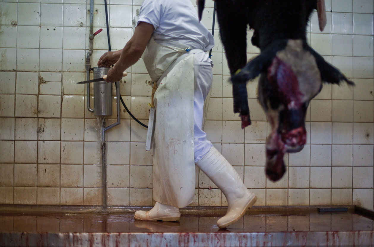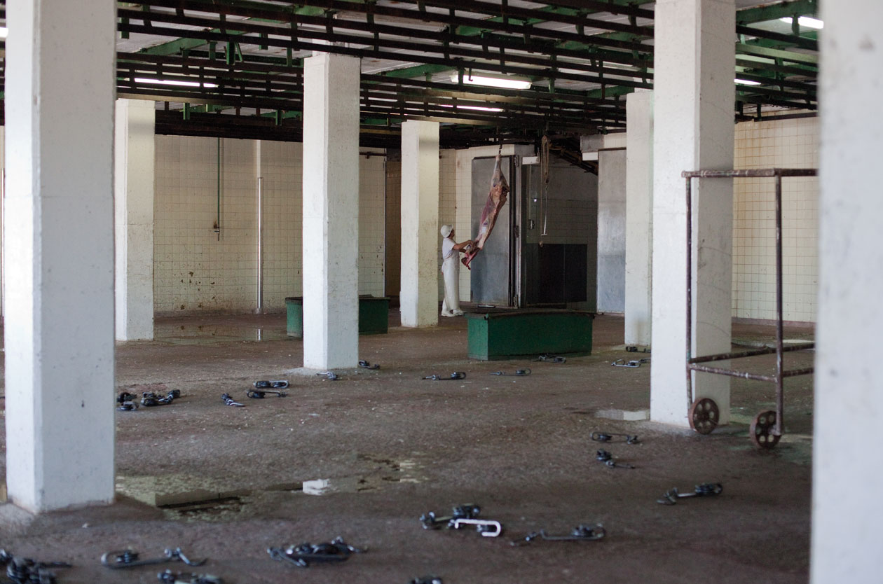 Las vaquitas van de los corrales a un baño con duchas: agua fría, después caliente y otra vez fría. Avanzan, entonces, con menos estrés, con los músculos menos contraídos, hasta el marronazo, un martillo neumático Jarvis, que un tipo alto maneja con certeza a la vez que silba si hace falta, si alguna vaquita no levanta la trompa para el golpe que él necesita darle. Así, con ese desmayo, la vaca, el ternero, el novillito es colgado de una pata. Y don Ramón, unos metros más tarde, le clava su cuchillo y lo desangra para darle muerte y rienda suelta a un paseo rojo, bestial, matemático, exacto.