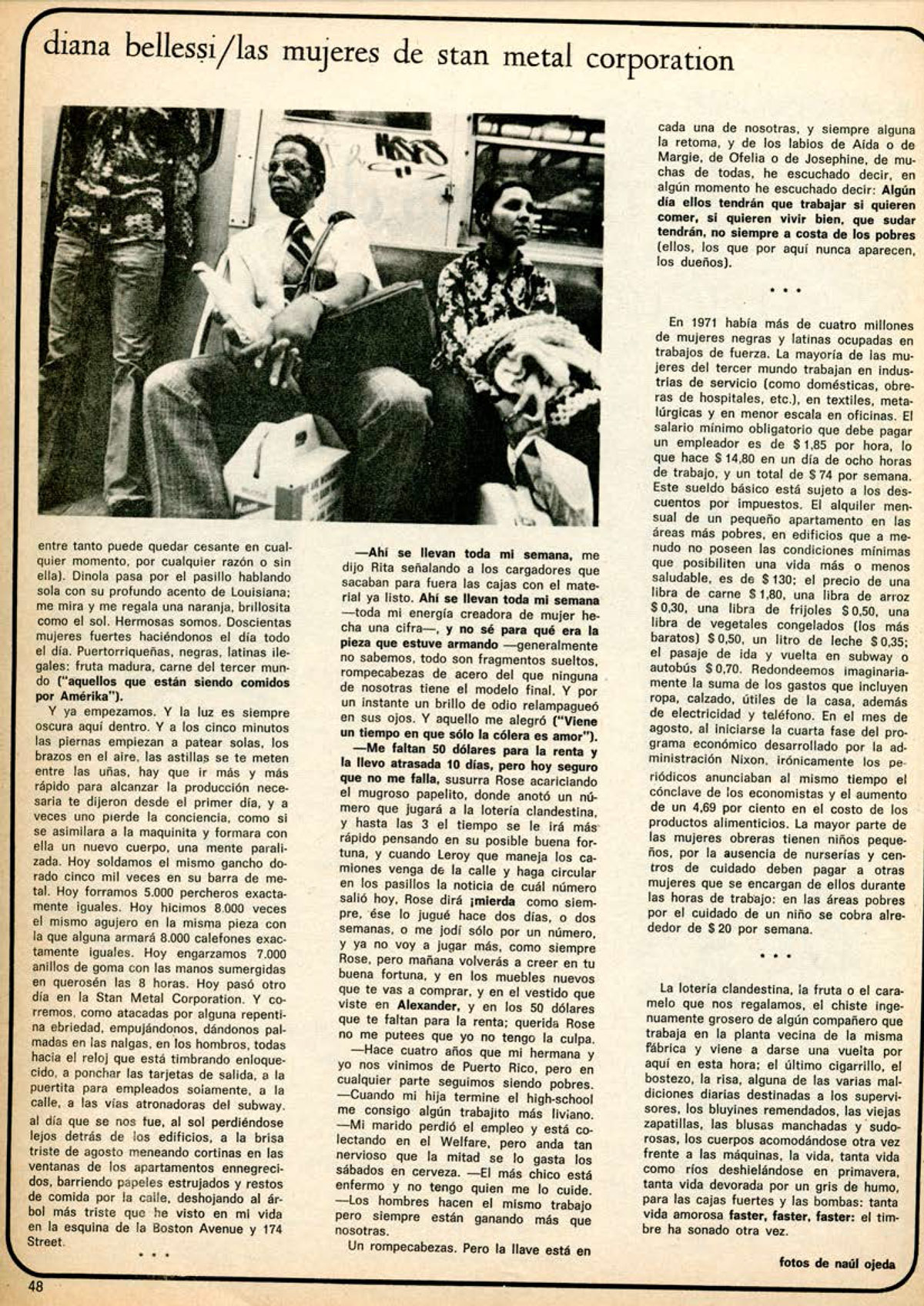 En 1971 había más de cuatro millones de mujeres negras y latinas ocupadas en trabajos de fuerza. La mayoría de las mujeres del Tercer Mundo trabajan en la industria de servicio (como domésticas, obreras de hospitales, etc.), en textiles, metalúrgicas, y en menor escala en oficinas. El salario mínimo obligatorio que debe pagar un empleador es de 1,85 por hora, lo que hace $14,80 en un día de ocho horas de trabajo, y un total de $74 por semana. Este sueldo básico está sujeto a los descuentos por impuestos. El alquiler mensual de un pequeño apartamento en las áreas más pobres, en edificios que a menudo no poseen las condiciones mínimas que posibiliten una vida más o menos saludable, es de $130. El precio de una libra de carne $1,80, una libra de arroz $0.30, una libra de frijoles $0,50, una libra de vegetales congelados (los más baratos) $0,50, un litro de leche $0,35; el pasaje de ida y vuelta en subway o autobús $0,70. Redondeemos imaginariamente la suma de los gastos que incluyen ropa, calzado, útiles de la casa, además de electricidad y teléfono. En el mes de agosto, al iniciarse la cuarta fase del programa económico desarrollando por la administración Nixon, irónicamente los periódicos anunciaban al mismo tiempo el cónclave de los economistas y el aumento de un 4,69 por ciento en el costo de los productos alimenticios. La mayor parte de las mujeres obreras tienen niños pequeños, por la ausencia de nurserías y centros de cuidado deben pagar a otras mujeres que se encargan de ellos durante las horas de trabajo: en las áreas pobres por el cuidado de un niño se cobra alrededor de $20 por semana.