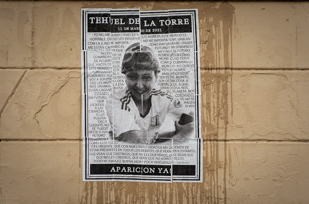 La calle sigue siendo de tierra y la casa de su infancia en Tristán Suárez, a casi una hora de la Ciudad de Buenos Aires, se parece mucho a esas que dibujan les niñes en los jardines de infantes: un techo a dos aguas, aunque acá sólo hay tejas en los aleros que cubren la ventana y la puerta. En esta casa blanca con un cactus añoso en el jardín delantero, la única señal externa de que Tehuel De La Torre –varón trans, 22 años- estuvo allí alguna vez es un cartel en blanco y negro que se funde en la circunferencia del poste de luz donde su sonrisa asoma congelada junto a esa pregunta que a más de 100 días de su desaparición nadie pudo contestar: ¿dónde está?