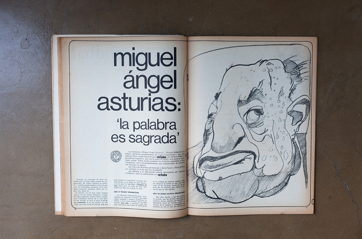 La entrevista a Miguel Ángel Asturias -Premio Nobel de Literatura, novelista guatemalteco de vasta trayectoria- fue realizada, en Paris, especialmente para Crisis por Milton Roberts. El periodista argentino, que murió poco después, había hecho también un extenso reportaje a Alejo Carpentier, pero lamentablemente sus anotaciones se extraviaron durante su agonía. Las fotos de Asturias pertenecen a Sara Facio y Alicia D’Amico; también el texto que las acompaña. Los dibujos y el manuscrito fueron entregados por Asturias a Roberts, para su publicación en Crisis.