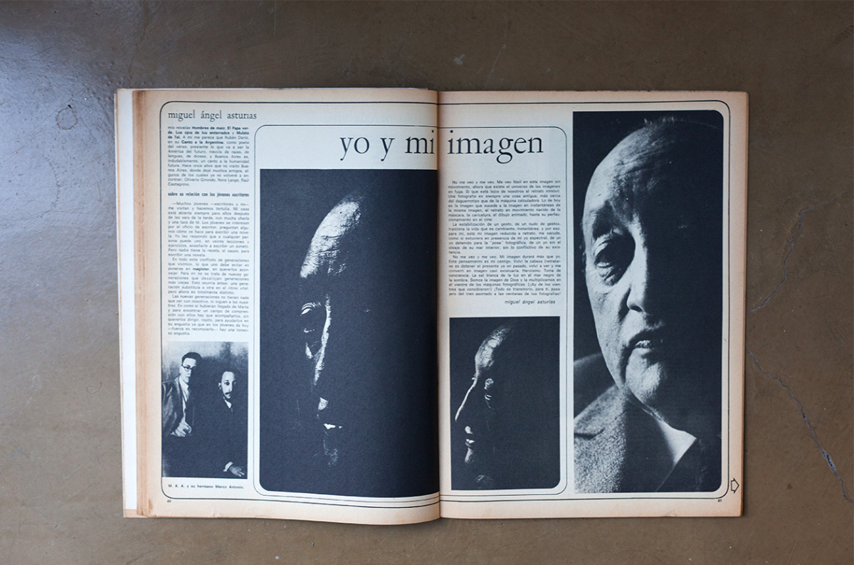 -A muchos les parecerá curioso, pero me place confesar que siento una gran nostalgia por Buenos Aires en especial por la calle Corrientes, que tantas veces crucé por las noches deteniéndome en las librerías, reuniéndome hasta la madrugada con escritores, periodistas y gente del teatro. Además, mi mujer es argentina. Buenos Aires fue para mí un ambiente muy favorable para escribir y allí produje mis novelas Hombres de maíz, El Papa verde, los ojos de los enterrados y Mulata de Tal. A mí me parece que Rubén Darío en su Canto a la Argentina, como poeta del verso, presiente lo que va a ser la América del futuro, mezcla de razas, de lenguas, de dioses, y Buenos Aires es, indudablemente, un canto a la humanidad futura. Hace ocho años que no visito Buenos Aires, donde dejé muchos amigos, algunos de los cuales ya no volveré a encontrar: Oliverio Girondo, Nora Lange, Raúl Castagnino.