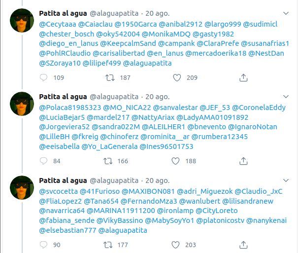 Para los que no están familiarizados con este tipo de práctica los tweets son bastante extraños porque se ven como una lista de usuarios y una imagen, pero en sectores de derecha a nivel internacional son bastante comunes. Normalmente los trenes no son fáciles de encontrar y están tapados por una intensa actividad de su comunidad.