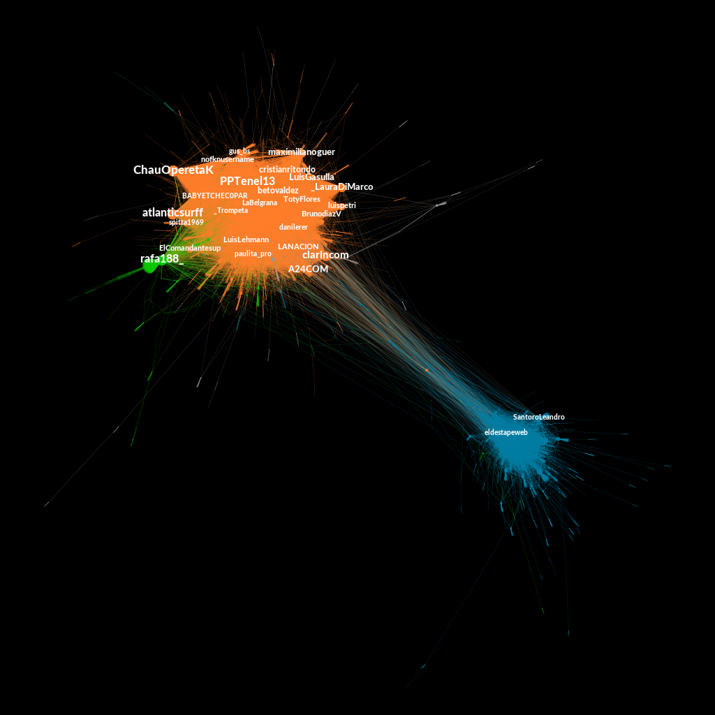En el gráfico destacamos a los usuarios jerárquicos del debate, esto es, los que recibieron más interacción y, a simple vista, podemos reconocer unas cuantas cuentas que están twiteando de manera antagónica. Si miramos el contenido de los tweets y las descripciones podemos confirmar que, mientras los naranjas están twiteando en contra de la reforma y tienen descripciones coherentes con la oposición, los azules son oficialistas twiteando a favor de la reforma.