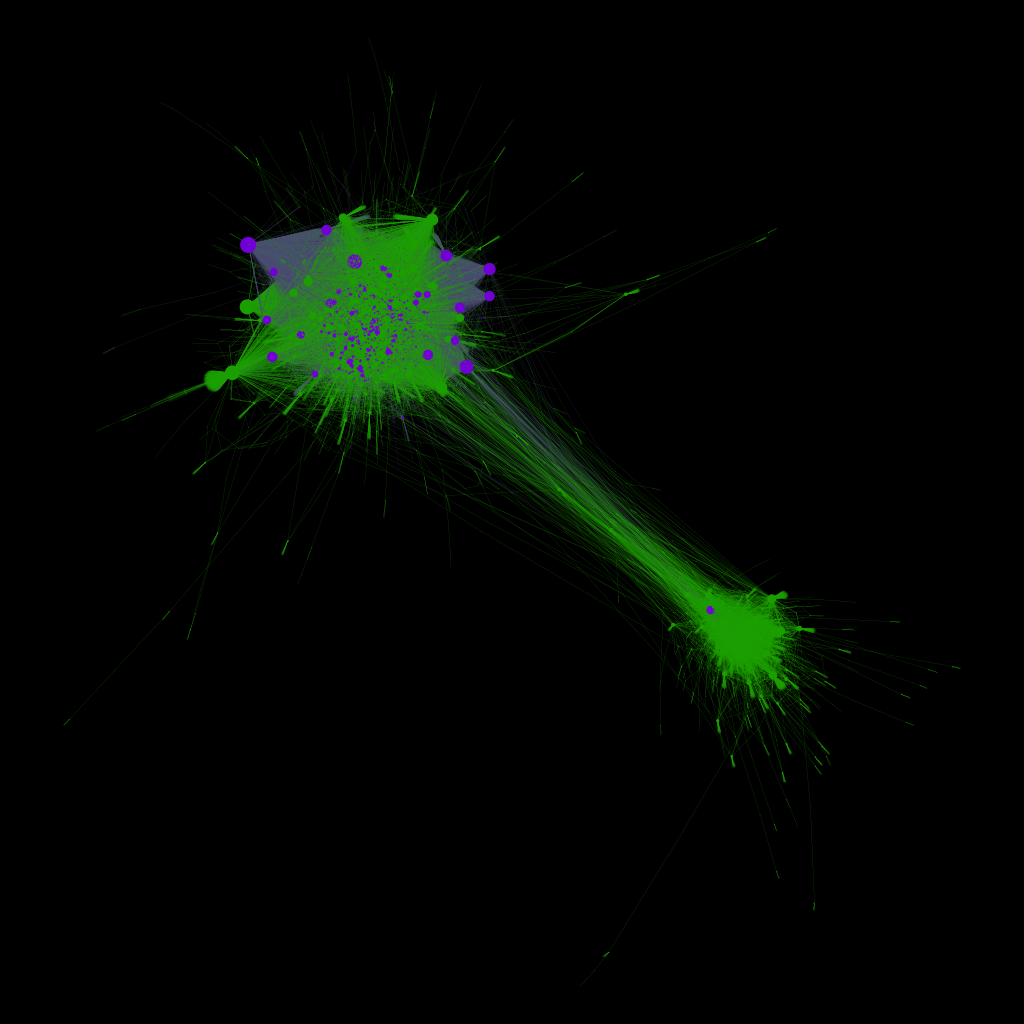 Ahora bien, ¿dónde están nuestros pasajeros de trenes en este debate? En el gráfico 2 presentamos la misma red, pero destacando solo aquellos que identificamos previamente como pasajeros, así nos queda el debate en verde y los pasajeros en violeta. Lo primero que podemos observar es que el 98% de ellos se ubica en la parte que habíamos identificado contraria a la Reforma Judicial.