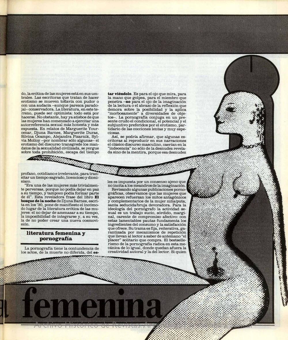Así, se podría afirmar, que algunas escritoras, al reproducir en sus narraciones el clásico discurso masculino, caerían en la “indecencia” no solo de la desnudez revelada sino de la mentira, porque esa desnudez les es impuesta por un consenso ajeno que no incita a los meandros de la imaginación. Revisando algunas publicaciones pornográficas, observamos que las mujeres que aparecen refuerzan los mitos antagónicos y complementarios de la mujer/niña puta, santa seducida/bruja devoradora. Para la ideología del pornógrafo la actividad sexual es un trabajo sucio, sórdido, marginal, carente de compromiso afectivo: con estas lamentables pautas fundamenta los ingredientes del consumo y la satisfacción que ofrece. Su trama es fija, reiterativa, garantizada por mecanismos de repetición que llevan al lector a saber de antemano “el placer” solitario que compra. El bestsellerismo de la pornografía radica en esta mecánica de lo igual, donde quedan afuera la creatividad autoral y la del lector. Si quien redacta estas narraciones es un hombre o una mujer da lo mismo, su consumidor es masculino y su objeto fragmentado es carne femenina. El eje vector al que se le rinde tributo y al que se promete erigir hasta su máxima posibilidad, es un miembro viril de tamaño inexistente, casi un látigo o -para compensar impotencias cotidianas- el cetro de un emperador. A ese eje vector, eternamente erecto, se le dispensan recortes de diversas mujeres que fantasea propias y que se deshacen por él, y a las que paga con una violenta eyaculación. Estas técnicas de goce no estimulan a las mujeres y, por lo tanto, ninguna literatura que pretenda involucrar el placer femenino las contendría. Para las mujeres la pornografía unida a la violencia trae más miedo que placer. De ahí que no comprendan la ideología del pornógrafo ni consuman pornografía. El extremo opuesto de estas publicaciones bastardas está representado por las novelitas de amor, las fotonovelas y los radioteatros –casi todos de carácter platónico– que satisfacen algún área de la sexualidad sometida femenina. Entre ambos extremos, la literatura femenina debería descubrir sus propias técnicas amorosas y describir las «más bien como una continuidad en la cual ‘otra vez’ puede vivirse como una primera vez. Ambas cosas a un tiempo: un devenir siempre en movimiento», según señala la ensayista francesa Luce lrigaray. En la ficción pornográfica, la mujer es históricamente una perfecta simuladora y tiene que aprender y recibirlo todo de los hombres-padres. Maestros de inmoralidad que la instruyen en sus propias leyes de voluptuosidad, con las que sólo gozan ellos, mientras ella finge. Las múltiples vejaciones de las heroínas demuestran que el pornógrafo cree o hace creer que la mujer goza con su servilismo. Otra vez estamos frente al goce tal como ellos lo desean y de espaldas al deseo de las mujeres. ¿Por qué, entonces, no ha surgido una pornografía inversa, con clítoris gozosos, cuerpos despedazados de hombres serviles? Porque la mujer tampoco es sensible a este espectáculo. ¿Por qué todavía no ha creado una escena a la que sí es sensible? ¿La ha creado?, tal vez en el secreto espacio del goce solitario.