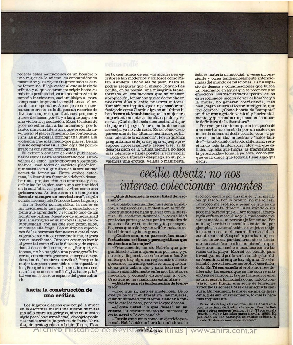¿Qué tenían para decir sobre el deseo las mujeres que durante años eran musas, aprendices, cuerpos consagrados al orgasmo del varón? Hoy todavía hay debates sobre el tema y recién en los últimos tiempos el goce femenino picó en punta. En este texto de 1987 en la revista crisis podemos ver cómo la escritora Reina Roffé se preguntaba por las fantasías femeninas y ponía el foco en esa tríada de erotismo, pornografía y sexualidad que hoy todavía nos genera preguntas sobre el goce más allá de las estructuras heteronormativas del patriarcado.