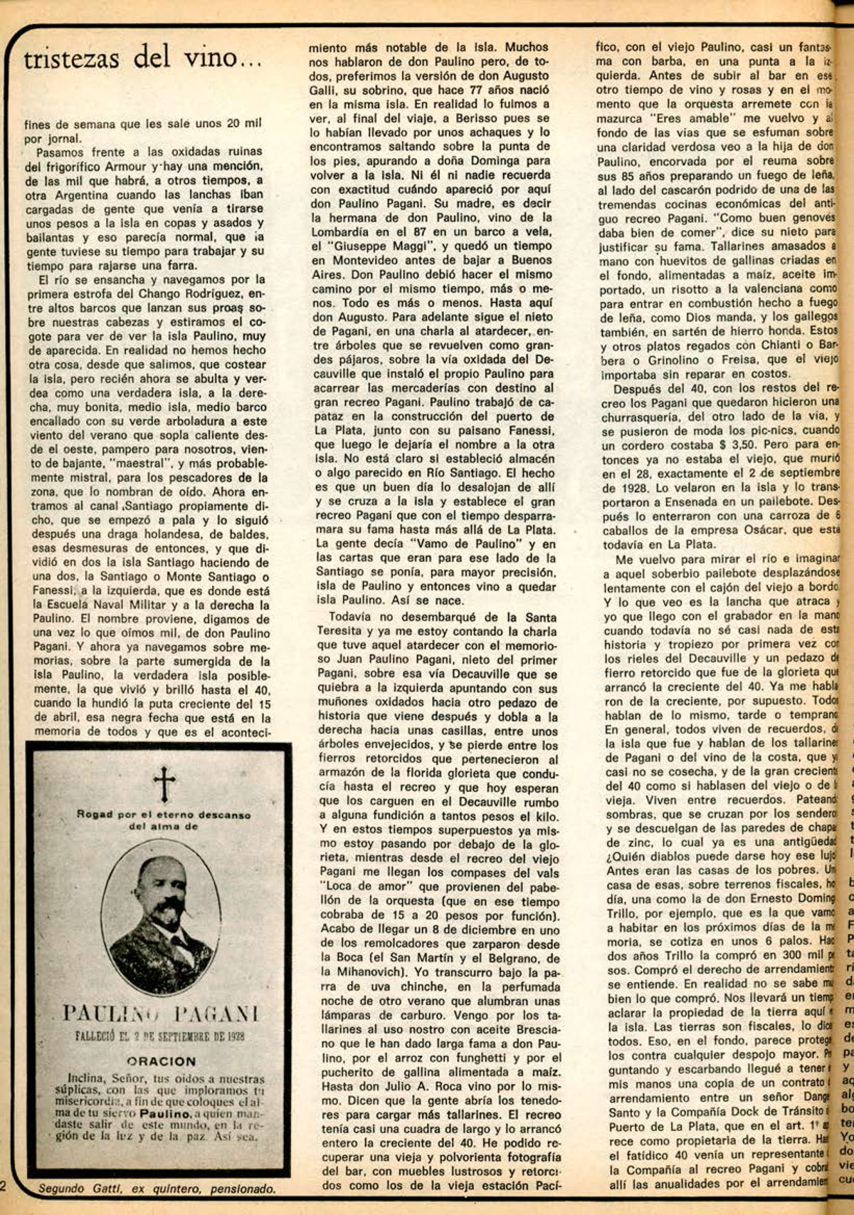 Y ahora ya navegamos sobre memorias, sobre la parte sumergida de la Isla Paulino, la verdadera isla posiblemente, la que vivió y brilló hasta el 40, cuando la hundió la puta creciente del 15 de abril, esa negra fecha que está en la memoria de todos y que es el acontecimiento más notable de la isla. Muchos nos hablaron de don Paulino pero, de todos, preferimos la versión de don Augusto Galli, su sobrino, que hace 77 años nació en la misma isla. En realidad lo fuimos a ver, al final del viaje, a Berisso pues se lo habían llevado por unos achaques y lo encontramos saltando sobre la punta de los pies, apurando a doña Dominga para volver a la isla. Ni él ni nadie recuerda con exactitud cuándo apareció por aquí don Paulino Pagani. Su madre, es decir la hermana de don Paulino, vino de la Lombardía en el 87 en un barco a vela, el “Giuseppe Maggi”, y quedó un tiempo en Montevideo antes de bajar a Buenos Aires. Don Paulino debió hacer el mismo camino por el mismo tiempo, más o menos. Todo es más o menos. Hasta aquí don Augusto. Para adelante sigue el nieto de Pagani, en una charla al atardecer, entre árboles que se revuelven como grandes pájaros, sobre la vía oxidada del Decauville que instaló el propio Paulino para acarrear las mercaderías con destino al gran recreo Pagani. Paulino trabajó de capataz en la construcción del puerto de La Plata, junto con su paisano Fanessi, que luego le dejaría el nombre a la otra isla. No está claro si estableció almacén o algo parecido en Río Santiago. El hecho es que un buen día lo desalojan de allí y se cruza a la isla y establece el gran recreo Pagani que con el tiempo desparramara su fama hasta más allá de la Plata. La gente decía «Vamo de Paulino» y en las cartas que eran para ese lado de la Santiago se ponía, para mayor precisión, isla de Paulino y entonces vino a quedar isla Paulino. Así se nace.