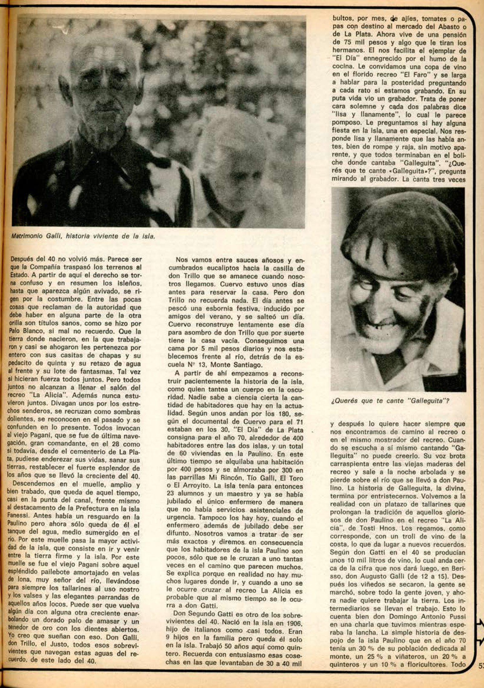 Don Segundo Gatti es otro de los sobrevivientes del 40. Nació en la isla en 1906, hijo de italianos como casi todos. Eran 9 hijos en la familia pero queda él solo en la isla. Trabajo 50 años aquí como quintero. Recuerda con entusiasmo esas cosechas en las que levantaban de 30 a 40 mil bultos, por mes, de ajíes, tomates o papas con destino al mercado del Abasto o de La Plata. Ahora vive de una pensión de 75 mil pesos y algo que le tiran los hermanos. Él nos facilita el ejemplar de «El Día» ennegrecido por el humo de la cocina. Le convidamos una copa de vino en el florido recreo «El Faro» y se larga a hablar para la posteridad preguntando a cada rato si estamos grabando. En su puta vida vio un grabador. Trata de poner cara solemne y cada dos palabras dice «Lisa y llanamente», lo cual le parece pomposo. Le preguntamos si hay alguna fiesta en la isla, una en especial. Nos responde lisa y llanamente que las había antes, bien de rompe y raja, sin motivo aparente, y que todos terminaban en el boliche donde cantaba «Galleguita». «¿Querés que te cante ‘Galleguita’?», pregunta mirando al grabador. La canta tres veces y después lo quiere hacer siempre que nos encontramos de camino al recreo o en el mismo mostrador del recreo. Cuando se escucha a sí mismo cantando «Galleguita» no puede creerlo. Su voz brota carraspienta entre las viejas maderas del recreo y sale a la noche arbolada y se pierde sobre el río que se llevó a don Paulino. La historia de Galleguita, la divina, termina por entristecernos.