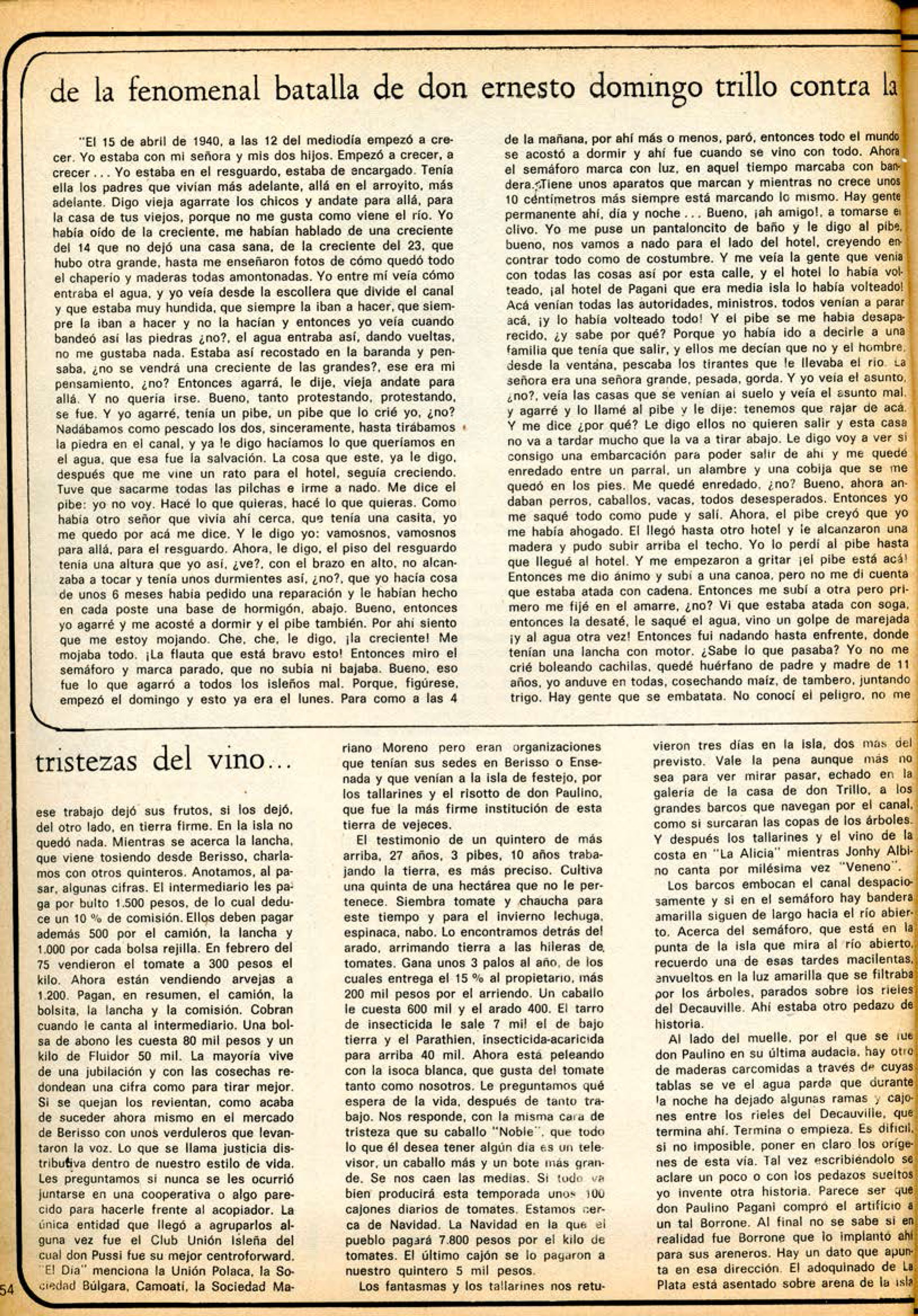 Volvemos a la realidad con un platazo de tallarines que prolongan la tradición de aquellos gloriosos de don Paulino en el recreo «La Alicia», de Tosti Hnos. Los regamos, como corresponde, con un troli de vino de la costa, lo que da lugar a nuevos recuerdos. Según don Gatti en el 40 se producían unos 10 mil litros de vino, lo cual anda cerca de la cifra que nos dará luego, en Berisso, don Augusto Galli (de 12 a 15). Después los viñedos se secaron, la gente se marchó, sobre todo la gente joven, y ahora nadie quiere trabajar la tierra. Los intermediarios se llevan el trabajo. Esto lo cuenta bien don Domingo Antonio Pussi en una charla que tuvimos mientras esperaba la lancha. La simple historia de despojo de la isla Paulino que en el año 70 tenía un 30% de su población dedicada al monte, un 25% a viñateros, un 20% a quinteros y un 10 % a floricultores. Todo ese trabajo dejó sus frutos, si los dejó, del otro lado, en tierra firme. En la isla no quedó nada.