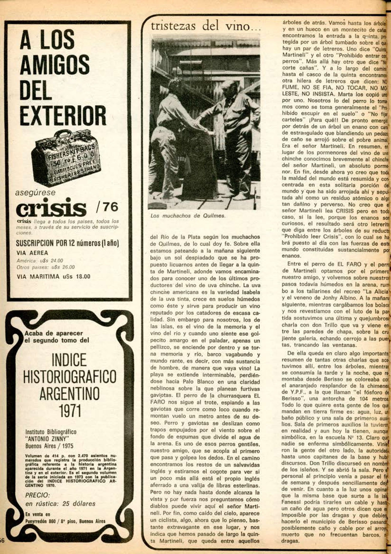 Vamos hasta los árboles y en un hueco en un montecito de cañas encontramos la entrada a la quinta, protegida por un árbol tumbado sobre el que hay un par de letreros. Uno dice «Quinta Martineli» y el otro «Prohibido entrar perros». Más allá hay otro que dice «No corte cañas». Y a lo largo del camino hasta el casco de la quinta encontramos otra hilera de letreros que dicen: NO FUME, NO SE FIA, NO TOCAR, NO MOLESTE, NO INSISTA. Marta los copió uno por uno. Nosotros lo del perro lo tomamos como se toma generalmente el «Prohibido escupir en el suelo» o «No fija carteles» ¡Para qué! De pronto emergido por detrás de un árbol un enano con cara de estrangulado que blandiendo un pedazo de caño se arrojó sobre el pobre animal. Era el señor Martineli. En resumen, en lugar de los pormenores del vino de uva chinche conocimos brevemente al chinche del señor Martineli, un absoluto pormenor. En fin, desde ahora yo creo que toda la maldad del mundo está resumida y concentrada en esta solitaria porción del mundo y que ha sido arrojada ahí y sepultada ahí como un residuo atómico o algo tan dañino y perverso. No creo que el señor Martineli lea CRISIS pero en todo caso, si la lee, porque los enanos son curiosos, el resultado será otro letrerito que diga entre los árboles de su reducto «Prohibido leer Crisis», con lo cual se habrá puesto al día con las fuerzas de este mundo constituidas sustancialmente por enanos.