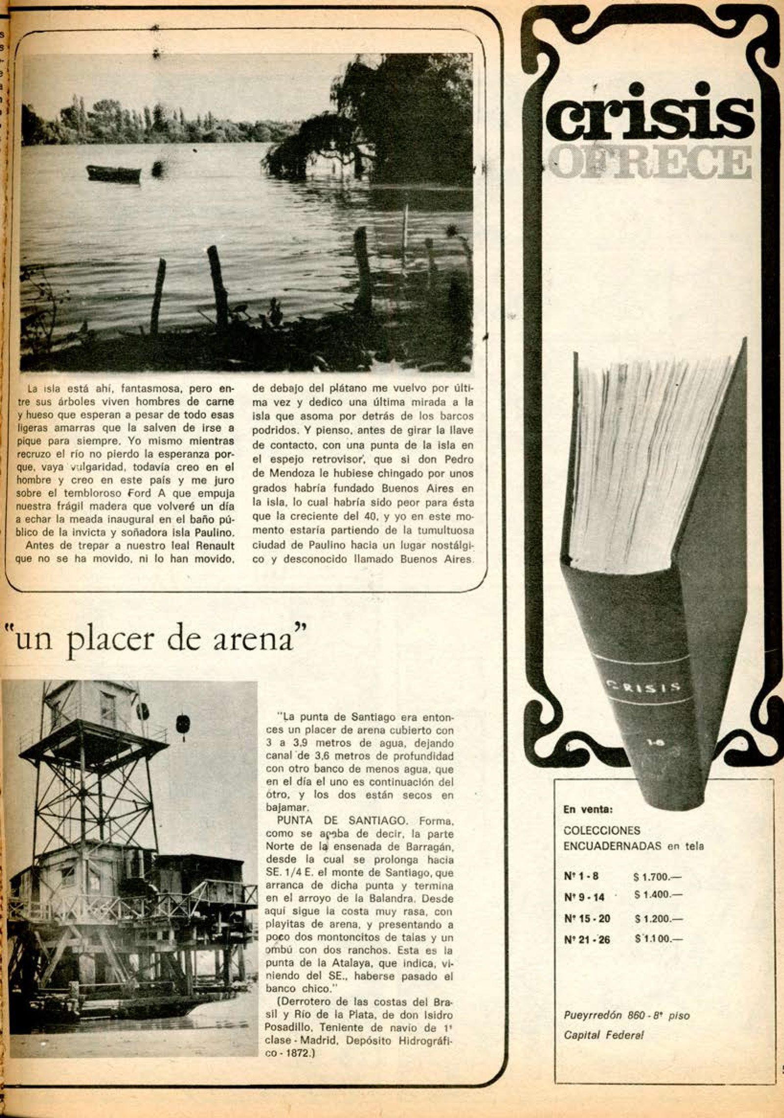 Me vuelvo para mirar el río e imaginar a aquel soberbio pailebote desplazándose lentamente con el cajón del viejo a bordo. Y lo que veo es la lancha que atraca y yo que llego con el grabador en la mano cuando todavía no sé casi nada de esta historia y tropiezo por primera vez con los rieles del Decauville y un pedazo de fierro retorcido que fue de la glorieta que arrancó la creciente del 40. Ya me hablaron de la creciente, por supuesto. Todos hablan de lo mismo, tarde o temprano. En general, todos viven de recuerdos, de la isla que fue y hablan de los tallarines de Pagani, o del vino de la costa, que ya casi no se cosecha, y de la gran creciente del 40 como si hablasen del viejo o de la vieja. Viven entre recuerdos. Pateando sombras que se cruzan por los sendero y se descuelgan de las paredes de chapa de zinc, lo cual ya es una antigüedad. ¿Quién diablos puede darse hoy ese lujo? Antes eran las casas de los pobres. Una casa de esas, sobre terrenos fiscales, hoy día, una como la de don Ernesto Trillo. Por ejemplo, que es la que vamos a habitar en los próximos días de la memoria se cotiza en unos 6 palos. Hace dos años Trillo la compró en 300 mil pesos. Compró el derecho de arrendamiento, se entiende. En realidad no se sabe bien lo que compró. Nos llevará un tiempo aclarar la propiedad de la tierra aquí en la isla.