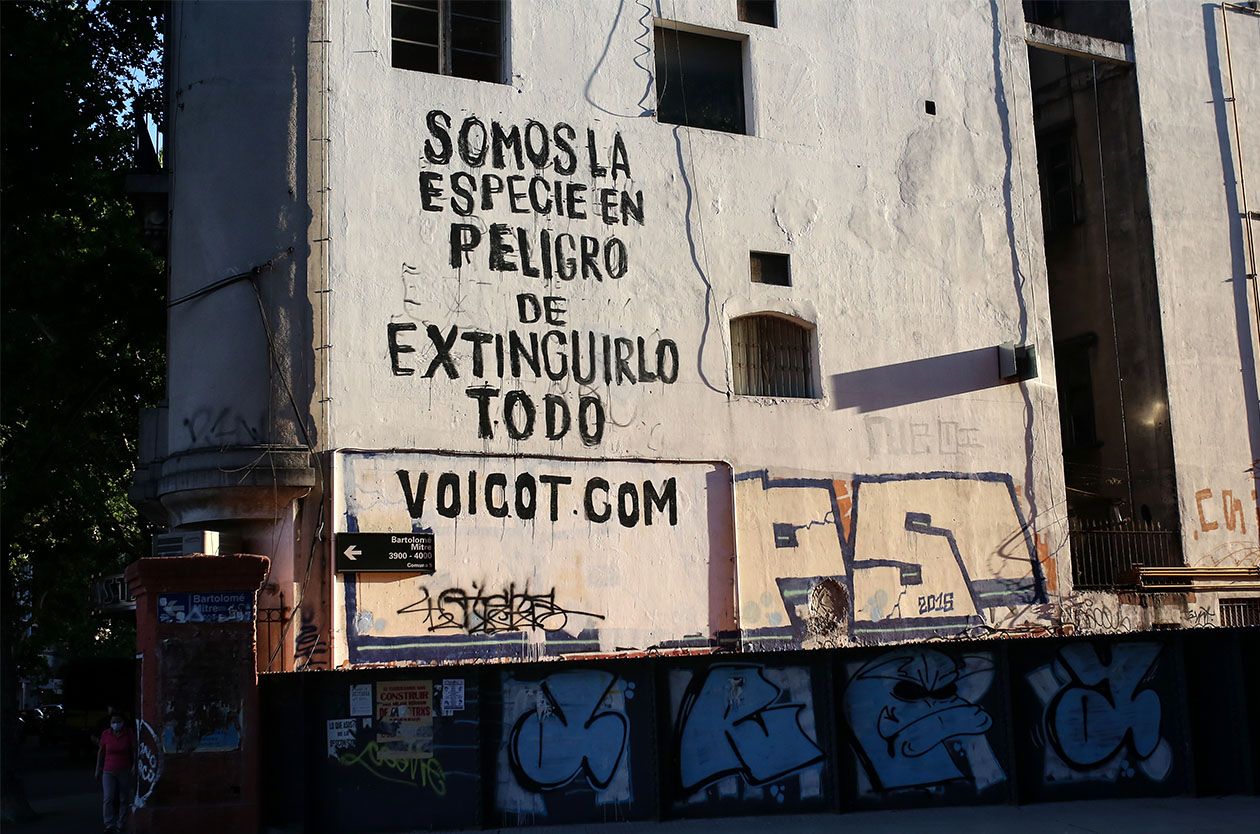 Es liderada por dos publicistas. Documentan el maltrato en mataderos, granjas porcinas o corrales avícolas. Cuentan con células de agitación y propaganda en casi todo el país, pegan afiches, organizan intervenciones performáticas y bardean al sistema político, aunque aseguran que el verdadero poder está en la industria. Dicen que somos la especie en peligro de extinguirlo todo. Voicot, la vanguardia del antiespecismo nacional.