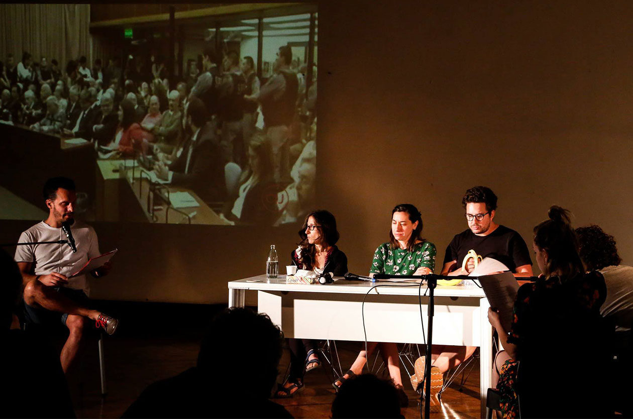 Es la segunda vez que veo Cuarto Intermedio, espero que llegue mi parte favorita pero falta. En cambio, llega el momento performático. F.B y M.Z(1) convocan a siete personas del público a que ocupen las posiciones de las salas de audiencias de los juicios: tres jueces, un fiscal, los abogados defensores y el testigo. Los voluntarios deben pasar, sentarse en la disposición habitual y actuar la transcripción de un momento del juicio ESMA. Cada une leerá un documento judicial que transcribe lo que se pronunció en una sala para narrar hechos que ocurrieron hace más de treinta años en el lugar en el que ahora estamos. Tres ciclos de citas, o repeticiones. Ese momento que ahora el público es invitado a actuar es el mismo que presenció F.B cuando fue a cumplir el encargo de Infojus y conoció a M.Z.