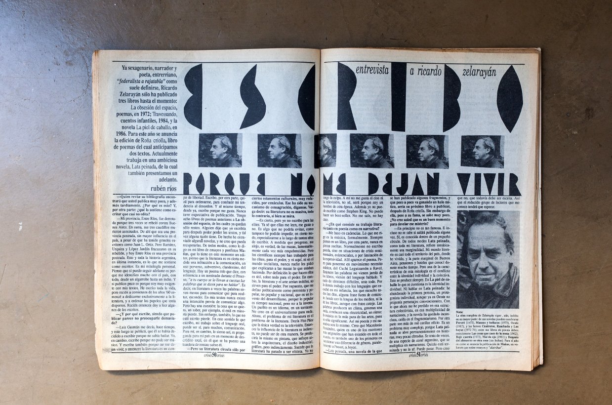 “Yo no escribo para las elites”, decía en 1989 Ricardo Zelarayán. Poesía, novela y otros textos de bordes difusos, en todos los géneros había sabido componer una obra breve y firme, con cadencia propia, alejada con esmero de los carriles literarios. Sus libros se publicaron sin entrar en las histerias del mercado. En esta entrevista publicada en la crisis #71, el autor entrerriano habla de eso. Y en tiempos donde parece haber más autores que lectores, hoy su mirada llega para poner en crisis cierta idea de que hay que publicar a cualquier precio.